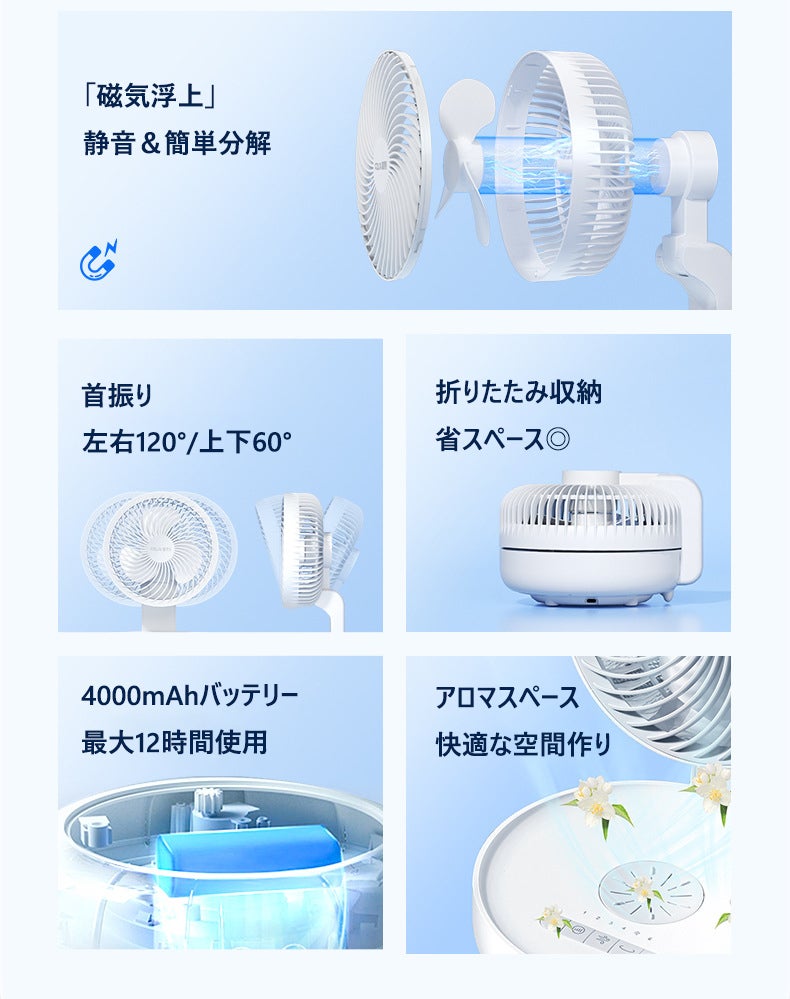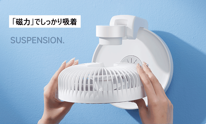 ファンとモーターが磁力で浮いたまま回転するため、内部はとてもシンプル。ネジも駆動部品も不要な構造で、工具なしでもサッと分解できます。だから、ファンヘッドはまるごと水洗いOK。