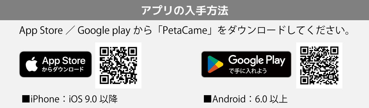 ※仕様やアプリは予告なく変更される場合があります。※信号機は撮影フレームと商用周波数との関係により点滅状態で録画されることがあります。※「Peta Came」は株式会社ブロードウォッチの登録商標です。