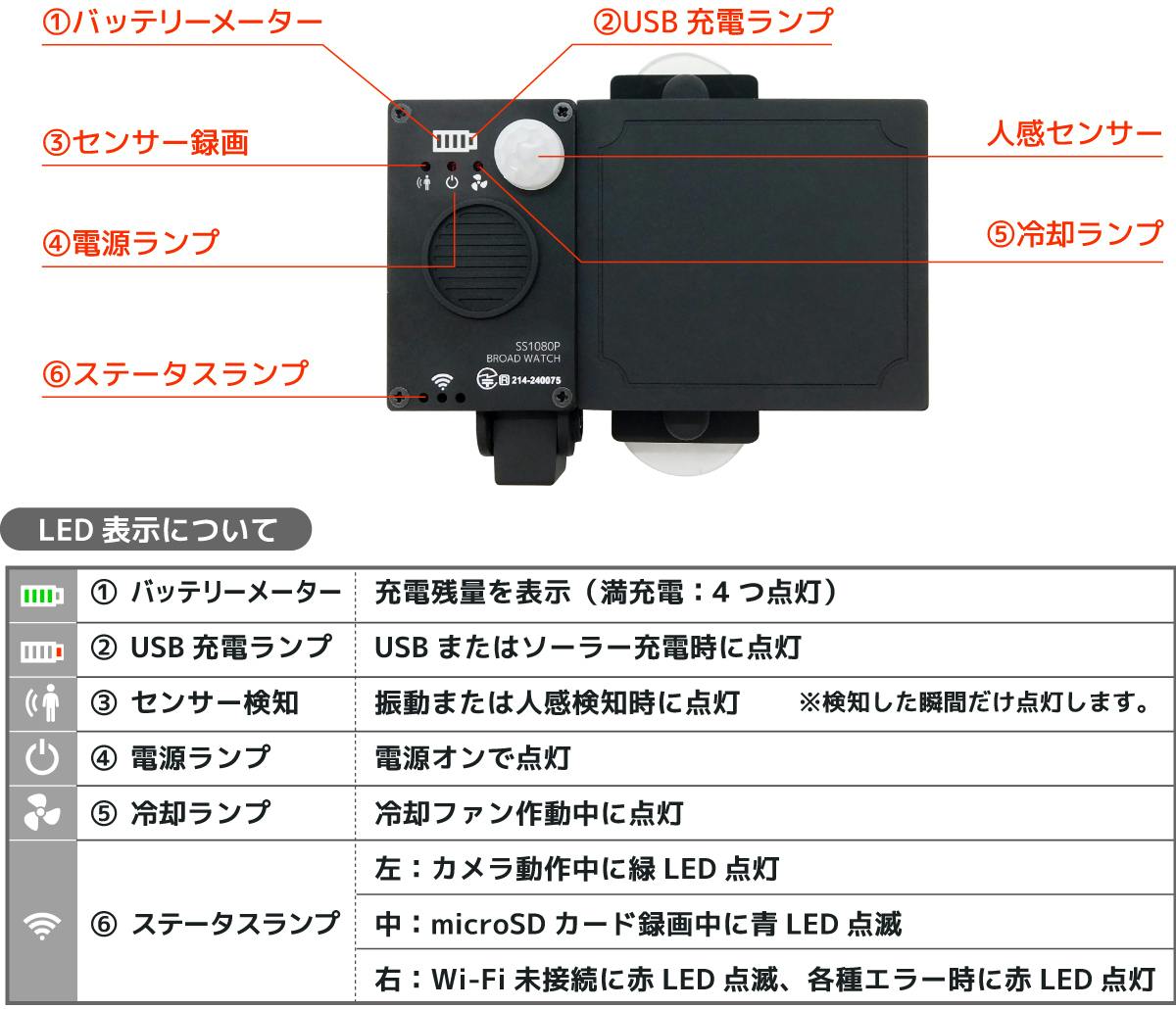 電池残量や録画の状況、Wi-Fiの接続状況はLEDライトで確認ができます。