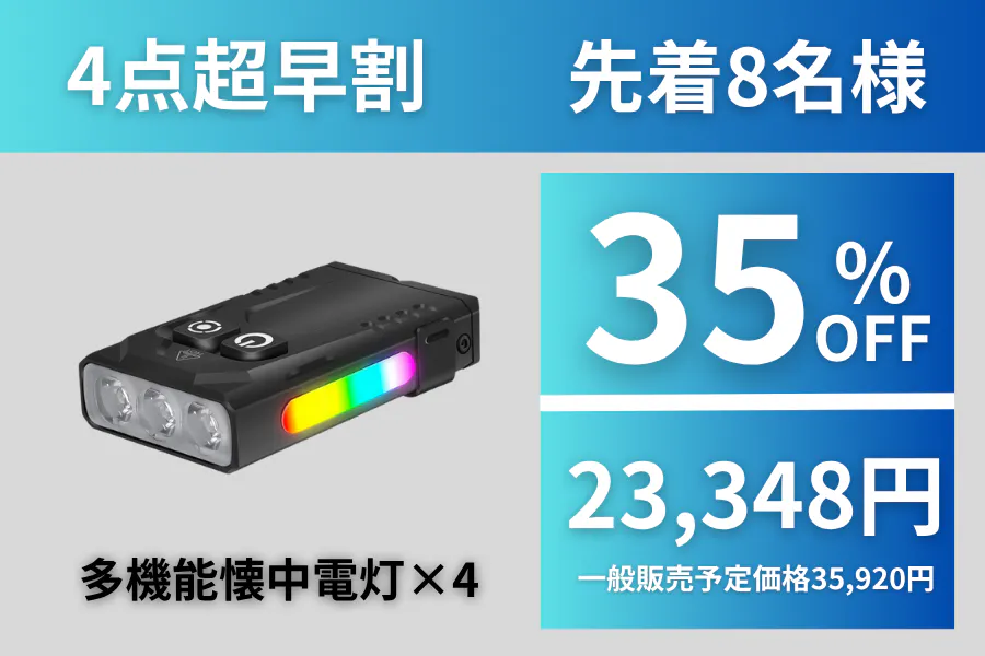 6. ライトの点灯モードはバッテリー残量により使用時間が変動します。特に高輝度モードでは消耗が早いため、使用後はこまめな充電をおすすめします。