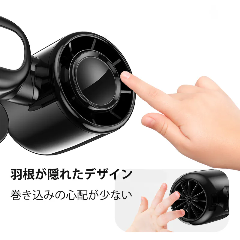 扇風機の羽根が隠れたデザインは、スタイリッシュで洗練された印象を与えます。また、使用中に手や髪の巻き込みの心配がなく、小さなお子様やペットても安心してご利用いただけます。