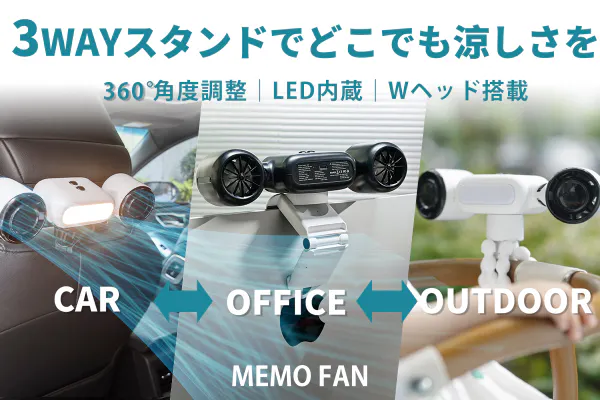 Memo Fanには、シーンに応じて使い分けられる3タイプのスタンドが付属。毎日の暮らしやお出かけが、もっと快適に生まれ変わります。