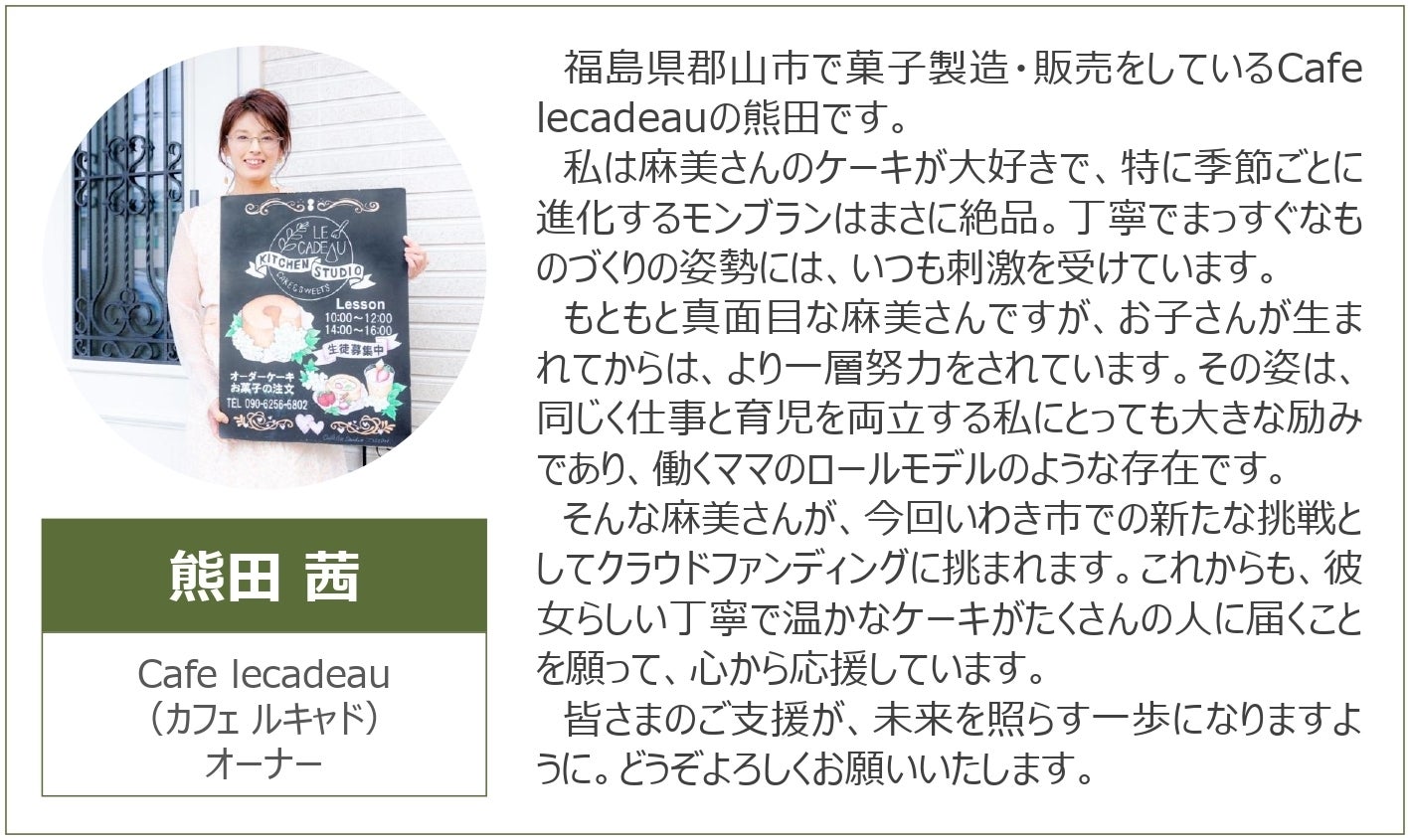 以前、いわき市植田町にて「手作り菓子 ファミーユ」というケーキ店を営んでいました。「ファミーユ」はフランス語で“家族”という意味です。