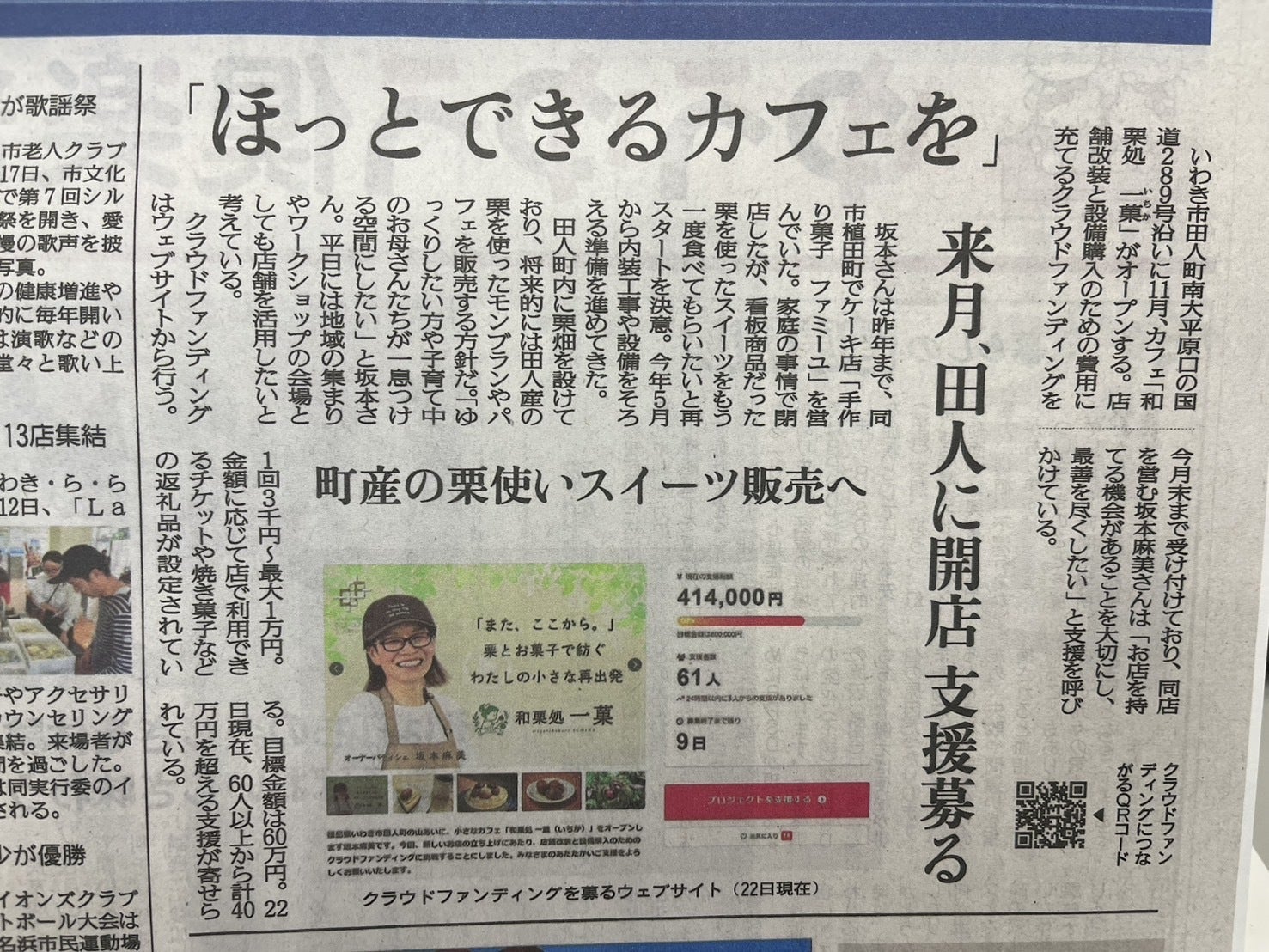 福島県いわき市田人町の山あいに、小さなカフェ「和栗処 一菓(いちか)」をオープンします坂本麻美です。
