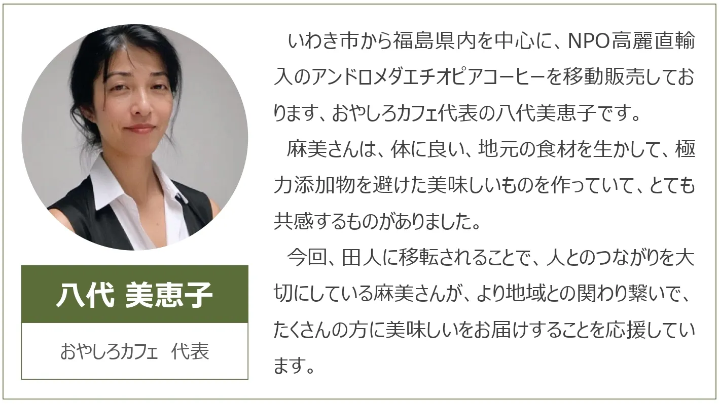 これまで支えてくれた方々や、前のお店に通ってくださった常連さんに恩返しがしたい。そして、「子どもたちが栗の木とともに成長していく山あいの家で、今度は家族と一緒に続けられるお店をつくりたい」と思い、今回、田人町での再スタートを決意しました。