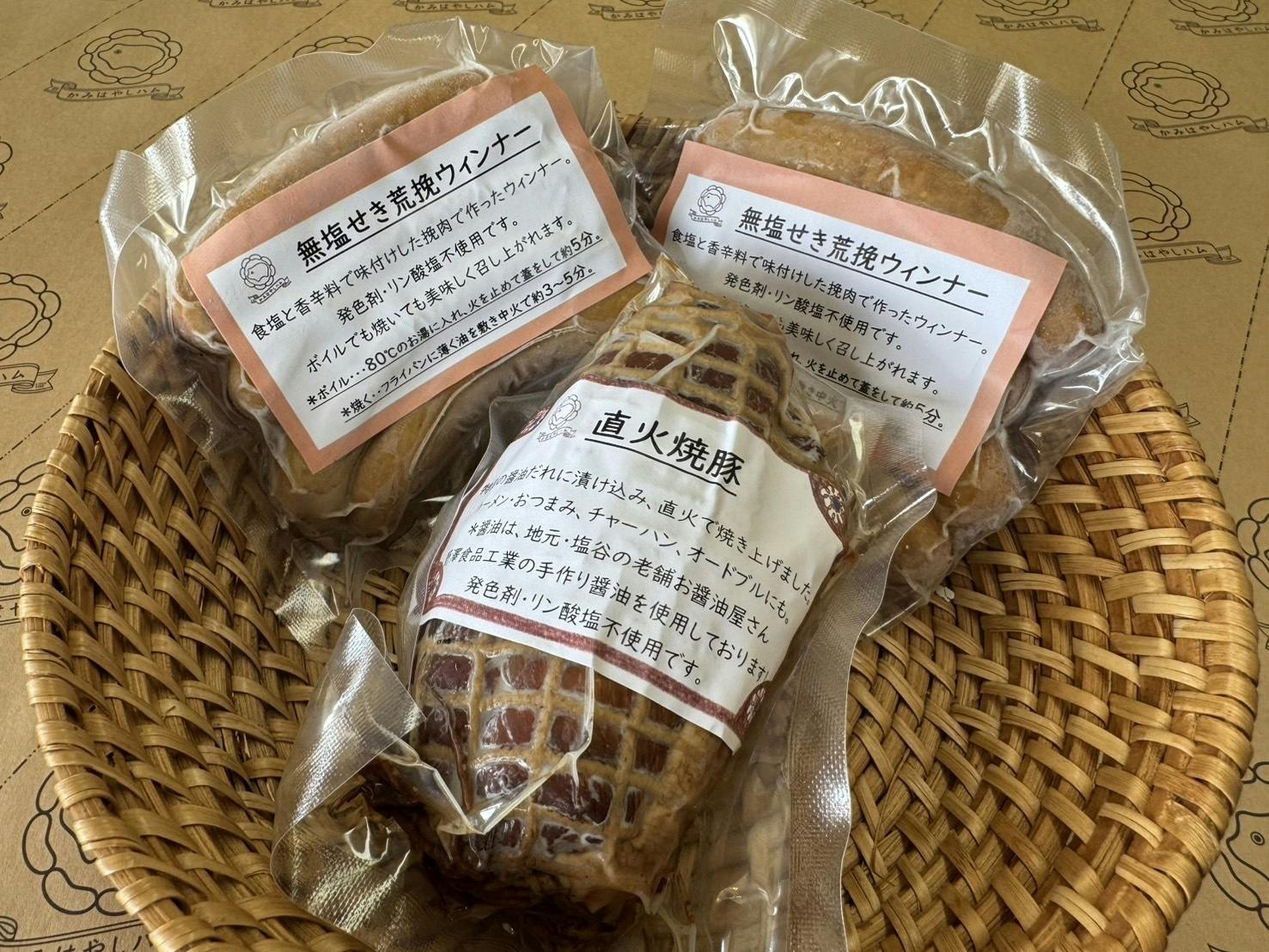 焼豚160gと無塩せき荒挽ウインナー×2の詰め合わせ。