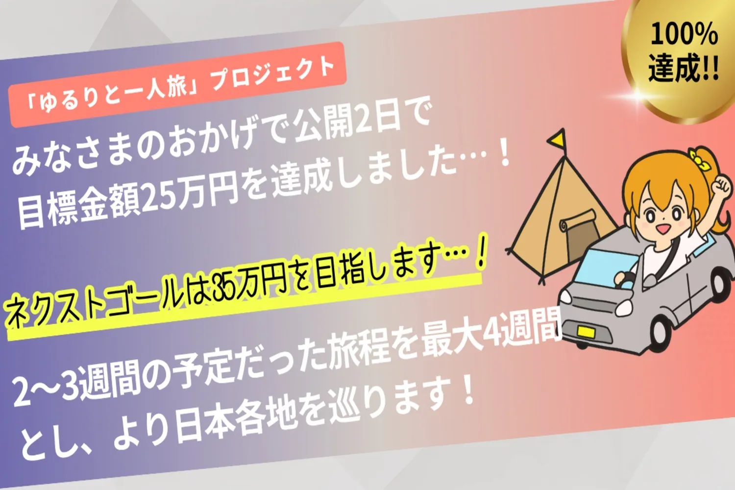 本プロジェクトは、さいきん落ち込みがちな私が、ドライブ旅をしながら心を整理し、そして支援者の皆さまに「旅行ブログ&気ままなエッセイ」を読んでいただく、というものです!!