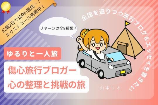 本プロジェクトは、さいきん落ち込みがちな私が、ドライブ旅をしながら心を整理し、そして支援者の皆さまに「旅行ブログ&気ままなエッセイ」を読んでいただく、というものです!!
