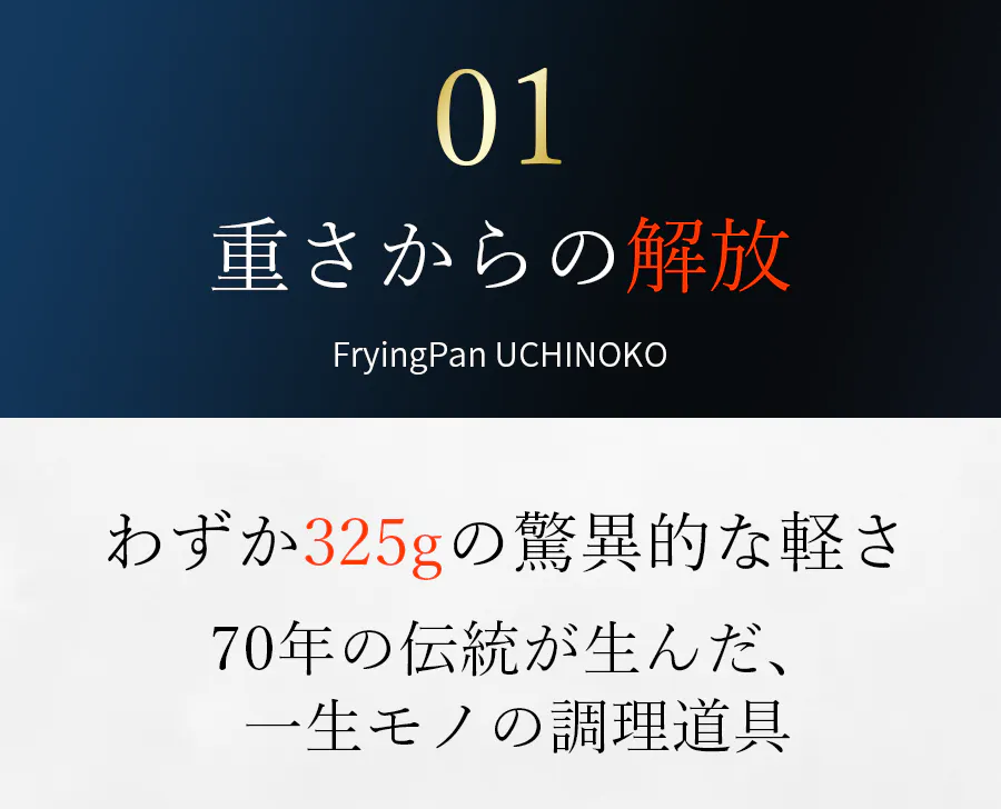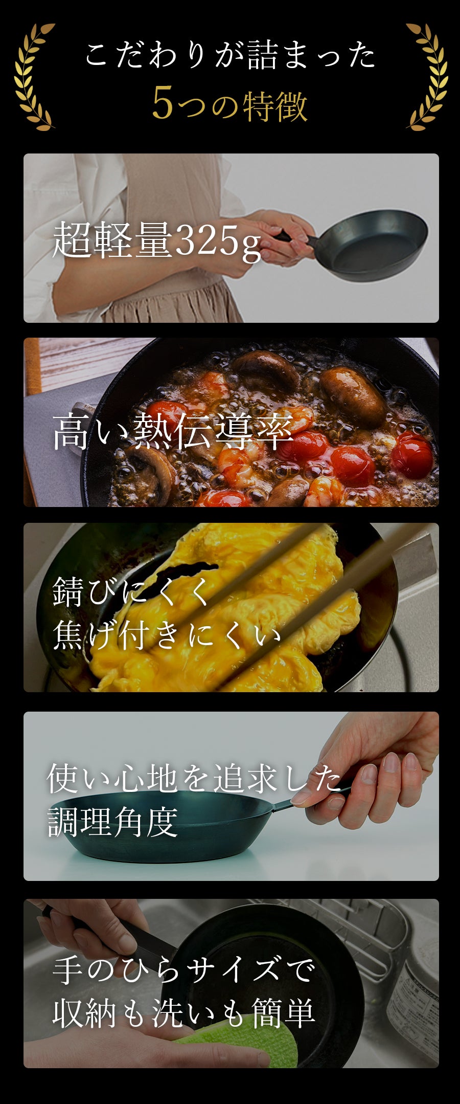 昭和26年創業の老舗メーカー「藤田金属」が手掛ける確かな品質。職人技で丁寧に手作業にて仕上げられた超軽量&極薄の鉄フライパンは、長い伝統が生んだ賜物。使うほどに味わいが増し、あなただけの一生モノへと育っていきます。