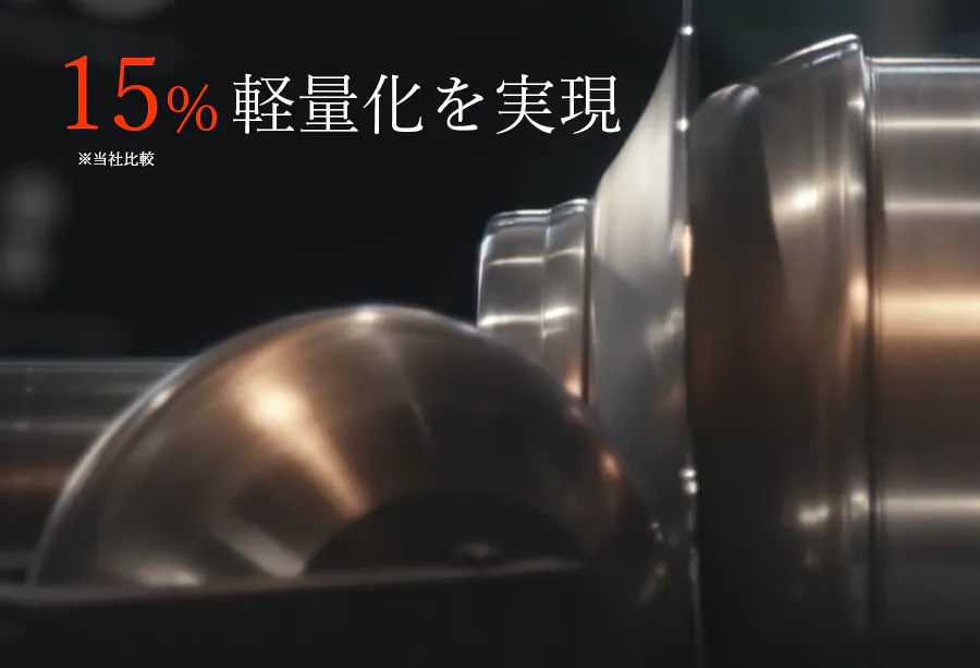 高速で鉄板を回転させ、そこにローラーを押し付けて成形する加工方法。この加工技術を用いることで、底面板厚1.4mmに対し、側面板厚を1.2mmまで薄くすることができます。これにより15%の軽量化を実現させました。