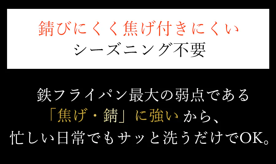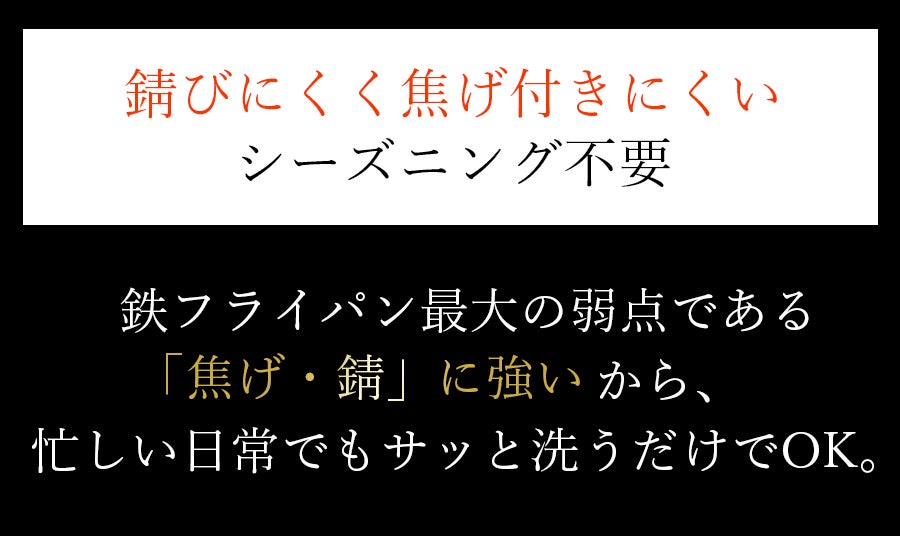 「鉄フライパンは手入れが大変」という常識を覆すハードテンパー加工を施しました。