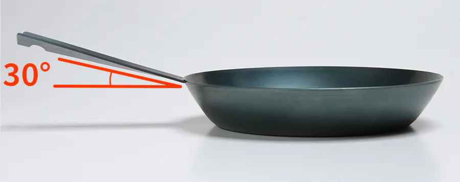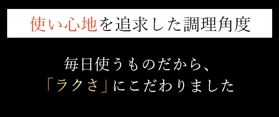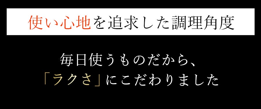 手首への負担を軽減し、長時間の料理もラクラク。腕の力を効率よく伝えられる「30°」の調理角度をご体験下さい!また、10.5cmの絶妙なハンドル長さでエプロンや衣服への引っかかりを防ぎます。