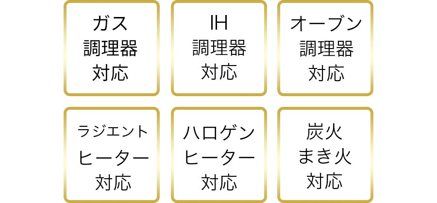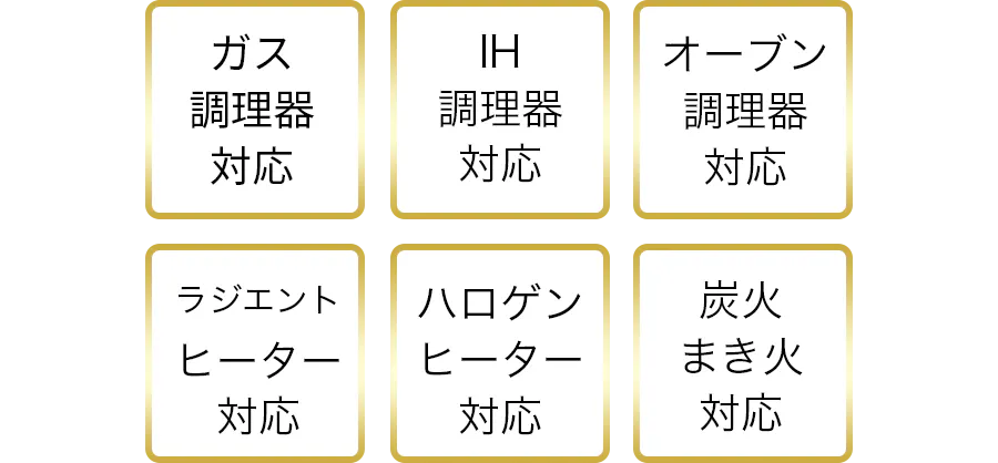 A、はい、ご使用いただけます。ガス・IH・オーブン・グリル・直火など様々な熱源に対応しているため、ご家庭ではもちろん、アウトドアでも活躍します。