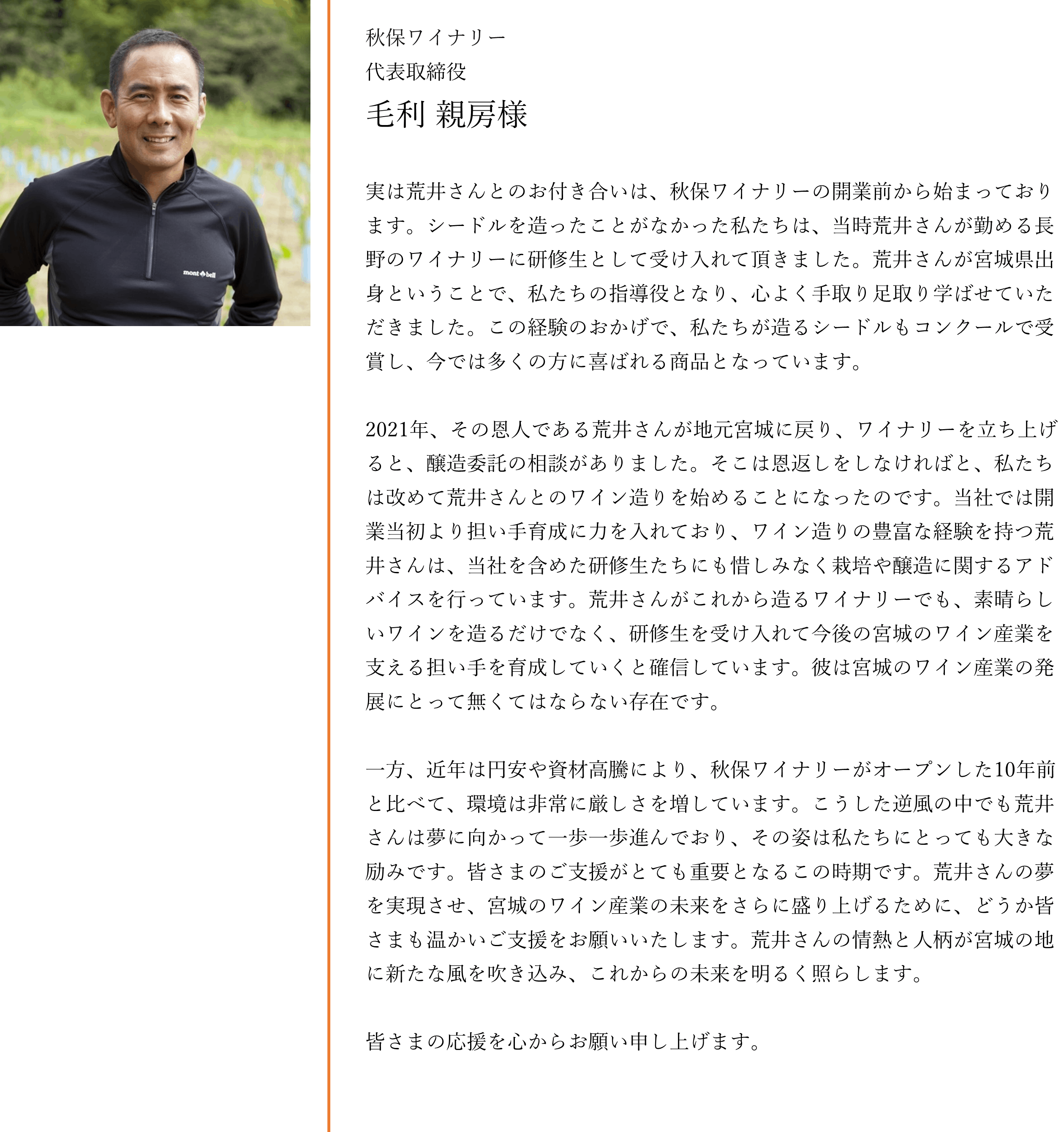 2025/11/22 14:27リターンについての補足ですプロジェクトページにも追記させていただきましたが50,000円以上のご支援の特典「代表 荒井 謙によるワイナリーツアー参加権利」ですが、お連れ様3名までOKとなります!(ご本人様合わせて4名)お友達と、ご家族と、皆様でお越しいただけます。Œnologues(エノログ ワイン醸造技術管理士)である荒井 謙のワイナリーツアーご満足いただけるよう精一杯ご案内させていただきます!是非よろしくお願いいたします。前職時代からワイナリーツアーの企画・担当をしていた弊社代表。このワイナリーツアーもしっかり企画させていただきます!沢山のご参加をお待ちしております。以下が『代表 荒井 謙によるワイナリーツアー参加権利』が付いているリターンとなります。(2025年11月22日現在情報)↓【ワイン・シードル4本セット + 代表によるワイナリーツアー参加権利! 】【自社畑100%ワイン1本 + ワイン・シードル6本セット + 代表によるワイナリーツアー参加権利!】【あなただけのオリジナルシードル50本 + 代表によるワイナリーツアー参加権利!】【あなただけのオリジナル樽熟成ワイン50本 + 代表によるワイナリーツアー参加権利!】【あなただけのオリジナルワイン100本 + 代表によるワイナリーツアー参加権利!】詳しくはプロジェクトページの「リターンを選ぶ」の欄をご覧ください。2026年秋スタート予定の新築醸造所と、自社畑を巡るワイナリーツアーに参加できます。 ※時期等は2027年12月末までの間で要相談どうぞよろしくお願いいたします! もっと見る