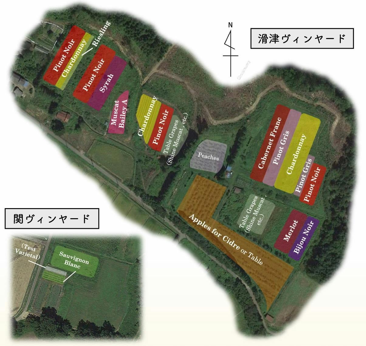 栽培品種:Chardonnay, Pinot Noir, Pinot Gris, Sauvignon Blanc, Cabernet Franc, Riesling, Merlot, Syrah, Bijou Noir, Muscat Bailey A, Gewürztraminer, Albariño, Muscat Blanc à Petits Grains(13種)