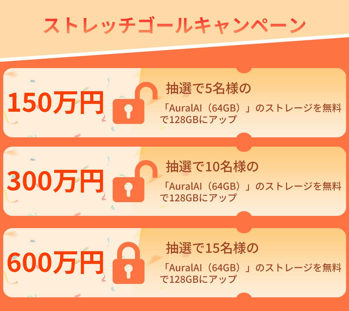 支援総額が3,000,000円を突破した場合は、さらに抽選で10名様の「AuralAI(64GB)」のストレージを無料で128GBにアップします!(達成済み)