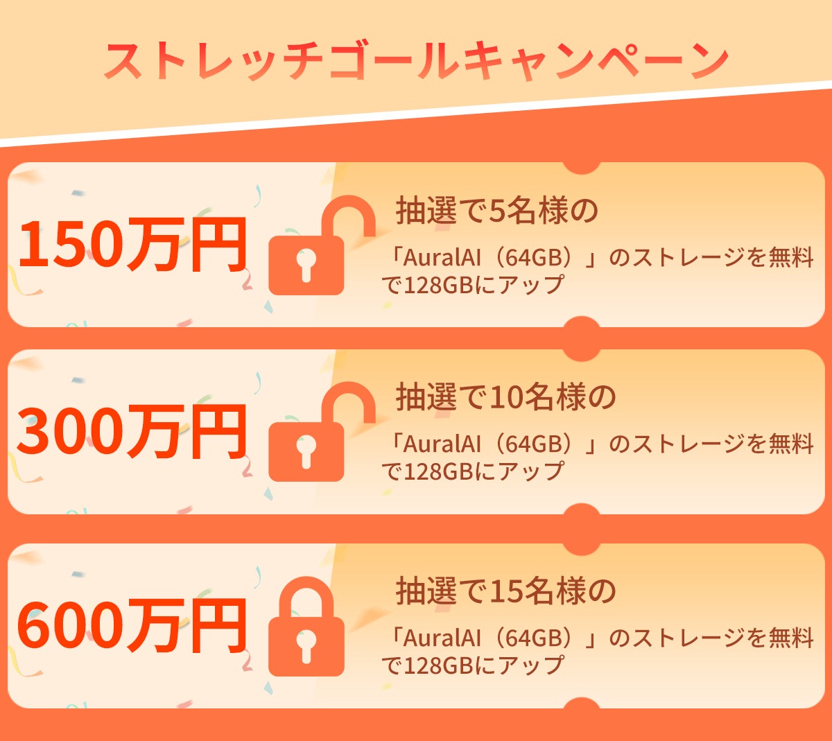 支援総額が6,000,000円を突破した場合は、さらに抽選で15名様の「AuralAI(64GB)」のストレージを無料で128GBにアップします!
