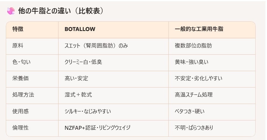 メーカーBoTallowが取り扱うGrass-fed beef tallow(完全草食の牛脂)は、皮膚科学的にも人間の皮脂に近い組成を持ち、炎症を悪化させずに保湿・保護が可能です。希少性が高いこの素材は敏感肌や乾燥肌に悩む方にとって、まさに『肌の味方』です。