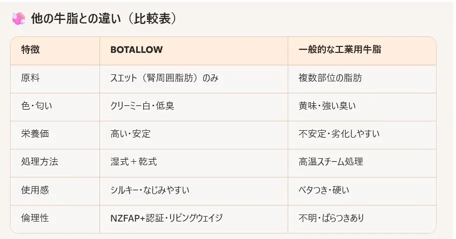 ビタミンA・D・E・K2を豊富に含み、乾燥・敏感・エイジング肌に深くアプローチ(原材料提供元のBoTallowの資料に基づく)します。