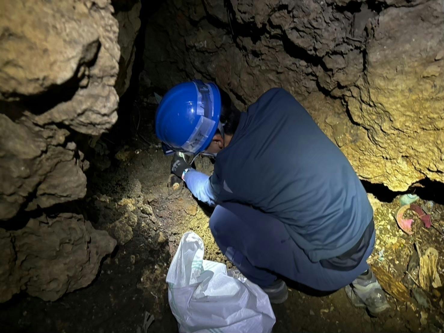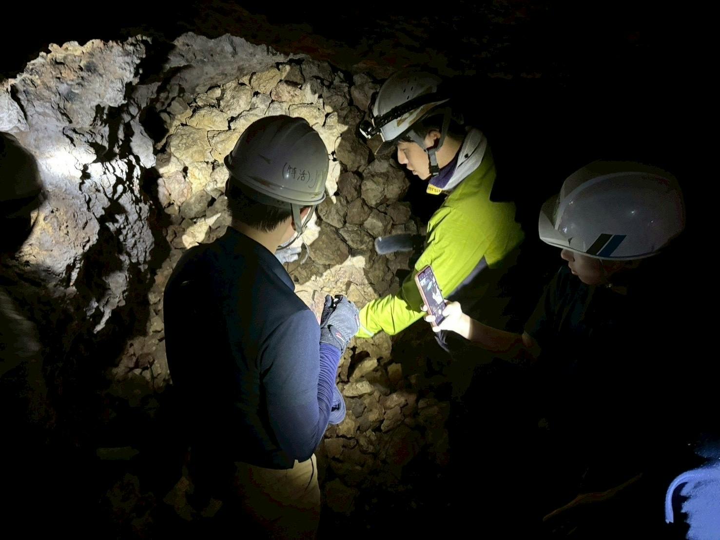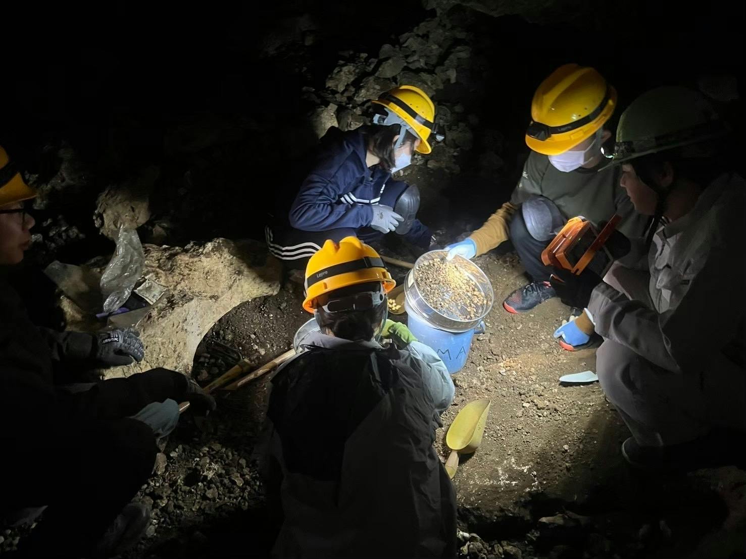 暗いガマのなかで活動する学生たち