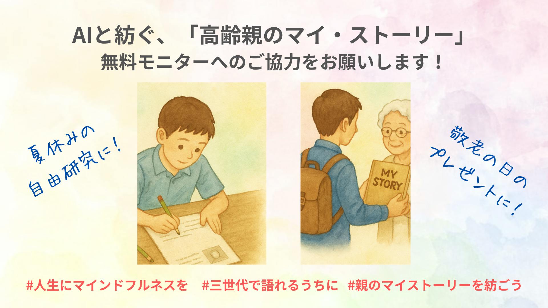 みなさん、こんにちは!Teachersの中場牧子です。わたしたちは「マイ・ストーリーカード」の可能性を広げる試みとして、2025年7月18日から9月15日まで、対話型AIを用いた《「親のマイ・ストーリーを紡ぐ:語られざる声に耳を澄ます」プロジェクト》を実施します。今回使用するAIには、「マイ・ストーリーを語る」シリーズでご紹介している自己探求を目的とした対話型AIに、更にスピリチュアルケアのふるまいも埋め込んだ高齢者の自分史作成に特化したものです。(スピリチュアルケアとは、病気や喪失、死を意識する時など、人生の困難な状況にある人が、生きる意味や価値を見失い、苦しみを抱えた時に、その人の心の奥底にある「存在の問い」に寄り添い、共に歩むケアのこと)実施概要◎ 募集期間:2025年7月18日(金)〜8月31日(日)◎ 実施推奨期間:お盆〜敬老の日(目安)◎ 参加無料◎ 参加条件:モニターとして①~③にご協力いただける方① いずれかの「マイ・ストーリーを語る」イベントに参加 イベント詳細 → https://note.com/teachersapp/n/n213d3d454839② キャンペーン終了後、簡単なアンケート(回答必須、5~10分程度)にお答えいただける方③ SNSシェアにご協力くださる方詳細は以下noteをご一読ください。https://note.com/teachersapp/n/nef458c5d3f8c#人生にマインドフルネスを #三世代で語れるうちに #親のマイストーリーを紡ごう