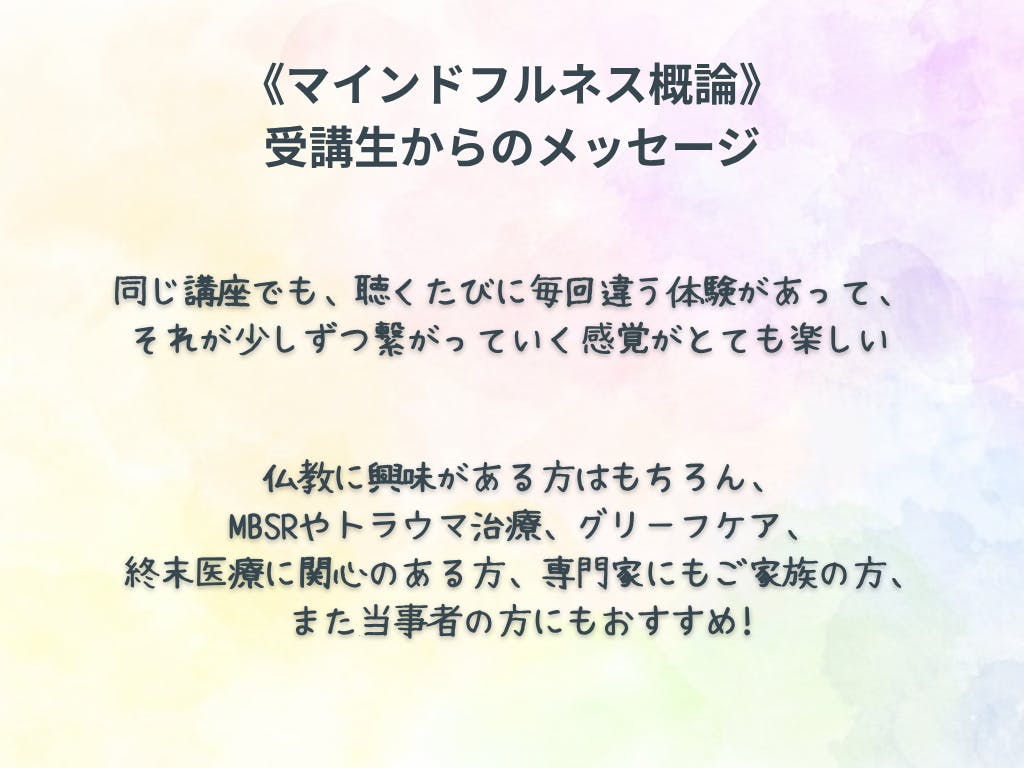 こんばんは!Teachersの中場牧子です。マインドフルネス概論の受講生の方から、受講の感想をいただきました。そのご紹介をいたします。① ヨーコさん(保育関係者)これまでは、自分の中に「あれ?」と思うようなパターンがあっても、それを見ないように、見ないようにしてきました。そして、そんなふうに見ないようにしている自分を責めて、さらにそれを責めている自分もまた責めてしまう──そんなループに陥っていました。でも、今回の学びで大きかったのは、「そのパターンを否定せずに、ただ見守る」という姿勢でした。この「見守る」ということが、とても難しいのですが、同時に深い優しさの芽生えも感じました。逃れたい気持ちを持っている自分に、少しずつ寄り添えるようになってきた気がします。概論は体調のこともあって、2回受講しました。繰り返し学ぶ中で、理解がじわじわと深まってきています。同じ講座でも、聴くたびに毎回違う体験があって、それが少しずつ繋がっていく感覚がとても楽しいです。いのちの感覚に、少しずつ素直になっていけたらいいなと、今はそう思えるようになってきました。そして、他者との関わり方にも、なにか小さな変化が起きているように感じています。このマインドフルネスに出会えて、本当に良かったと心から思います。② シンジさん(精神科医)マインドフルネス瞑想概論を受講して、あっという間の半年でしたが、とても充実していました。自分は精神科医・セラピストとしてトラウマ治療を学びながら、多くの人生に苦しむ方たちの回復の手伝いをしています。どのような心理治療においても、マインドフルな視点で自分の体験を見つめることが、回復の重要なベースであると感じています。ウィマラ先生の講義では、釈尊から伝わる瞑想法や当時の僧団の様子まで丁寧に教えていただき、深い学びが得られました。仏教に興味がある方はもちろん、MBSRやトラウマ治療、グリーフケア、終末医療に関心のある方、専門家にもご家族の方、また当事者の方にもおすすめの講座です。すでに瞑想を実践している方にも新たな気づきがあるはずです。ぜひこの機会に、この講座を体験してみてください!あと残り9日。最後まで頑張りますので、応援をよろしくお願いいたします!Teachers中場