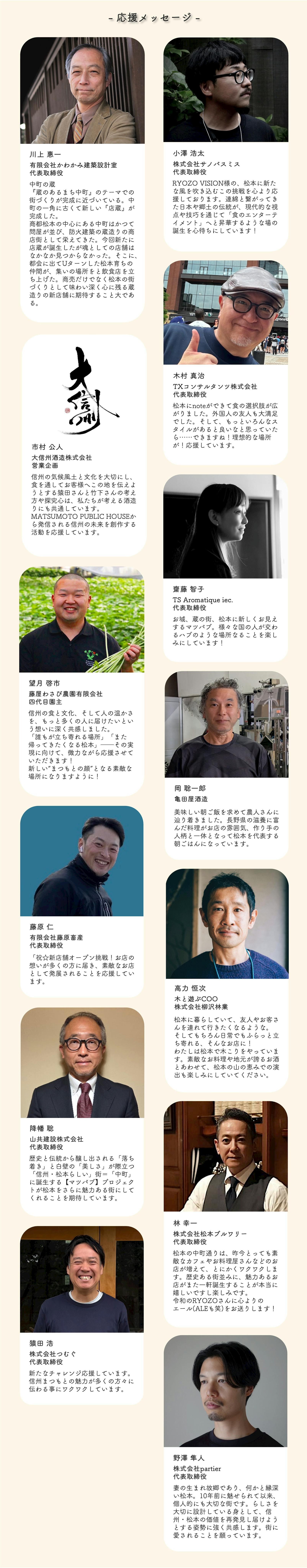 僕たちがやるからには提供するものは信州のものにこだわり、地元の方々には誇りに思ってもらえるような、県外や国外から集う方には信州を楽しめる、また帰ってきたくなるようなお店を目指します。