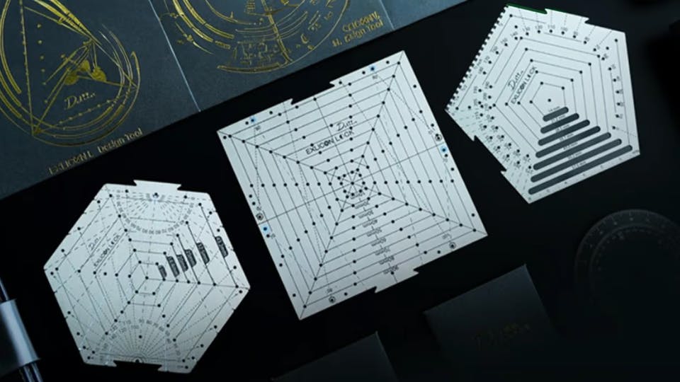「EXLICON LOCK」はスクエア(四角形)・ヘキサゴン(六角形)・ペンタゴン(五角形)という3つ定規で構成された、作図の効率を上げるプロ仕様のデザインツール。