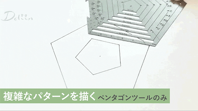 主な使い方は各ツールの形状を活かしつつ、直線と角度を決めて結んでいく感じ。工夫次第で多様なデザインや複雑な幾何学模様まで作図が可能になります。〉