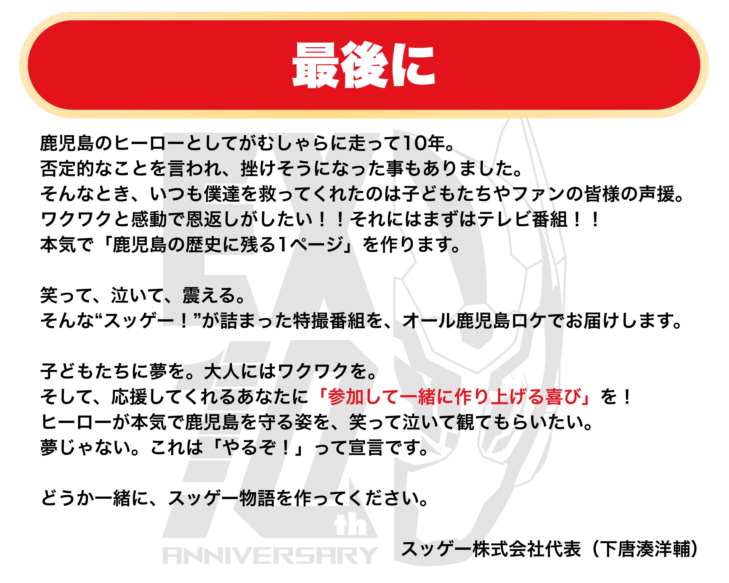 クラファン大成功おめでとう御座います! スッゲーヒーローズのこれまでの頑張り、繋がり、そして多くの方から愛されている証だと思います! 安全第一で、素敵な番組制作頑張ってください!