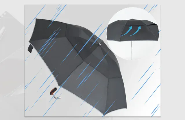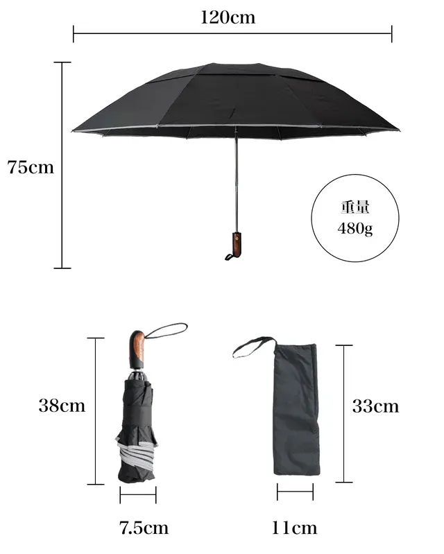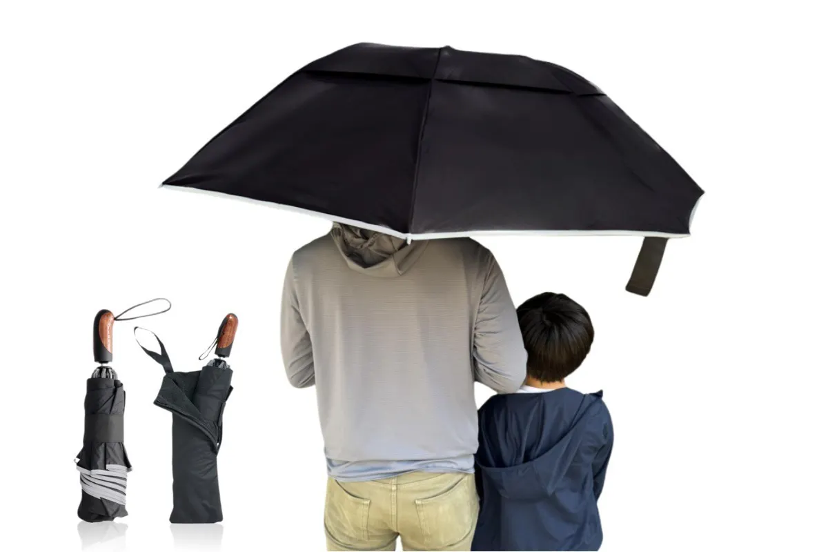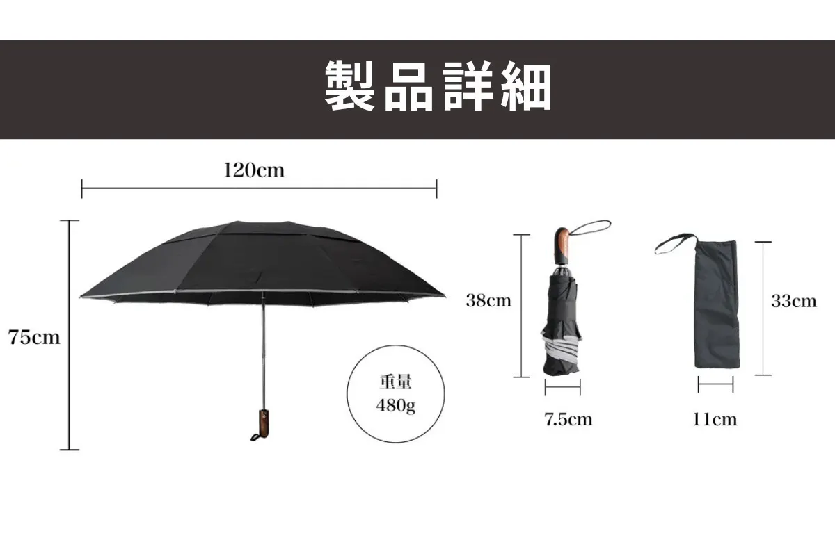 A:幅120cmの大型サイズで、自分と周りを守ってくれる、新しい逆折り式自動開閉折りたたみ傘です。