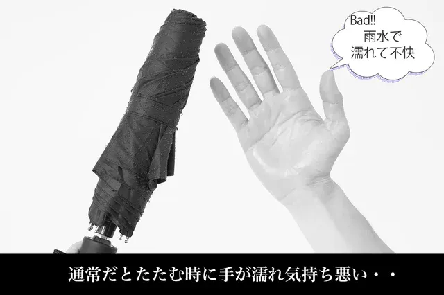 通常の傘は雨粒を振り落としても、どうしても傘に残ってしまい、置くと周りを濡らしてしまいます。