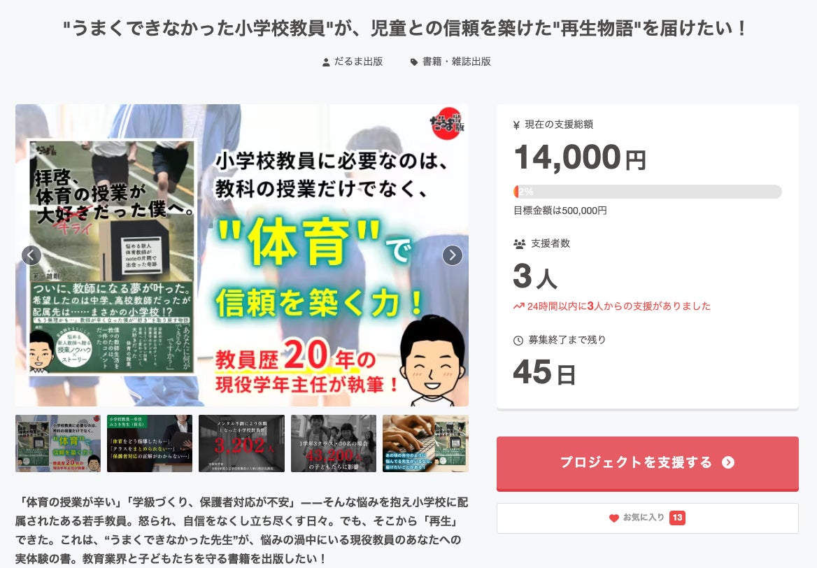 現在3名のあなたから、14,000円のご支援をいただいております。「お気に入り登録」での応援もありがたいです!ありがとうございます!