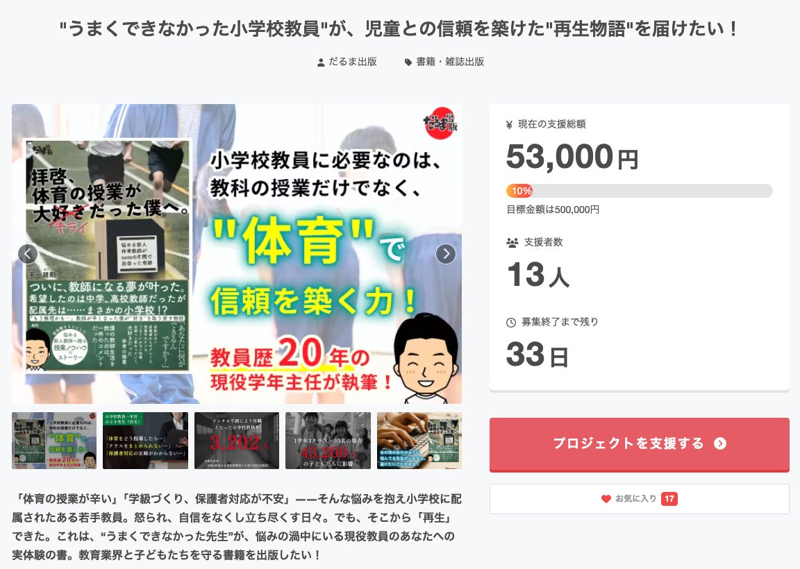クラウドファンディング開始から13日目となりました!現在13名の皆さんから、53,000円のご支援をいただいております。ありがとうございます!