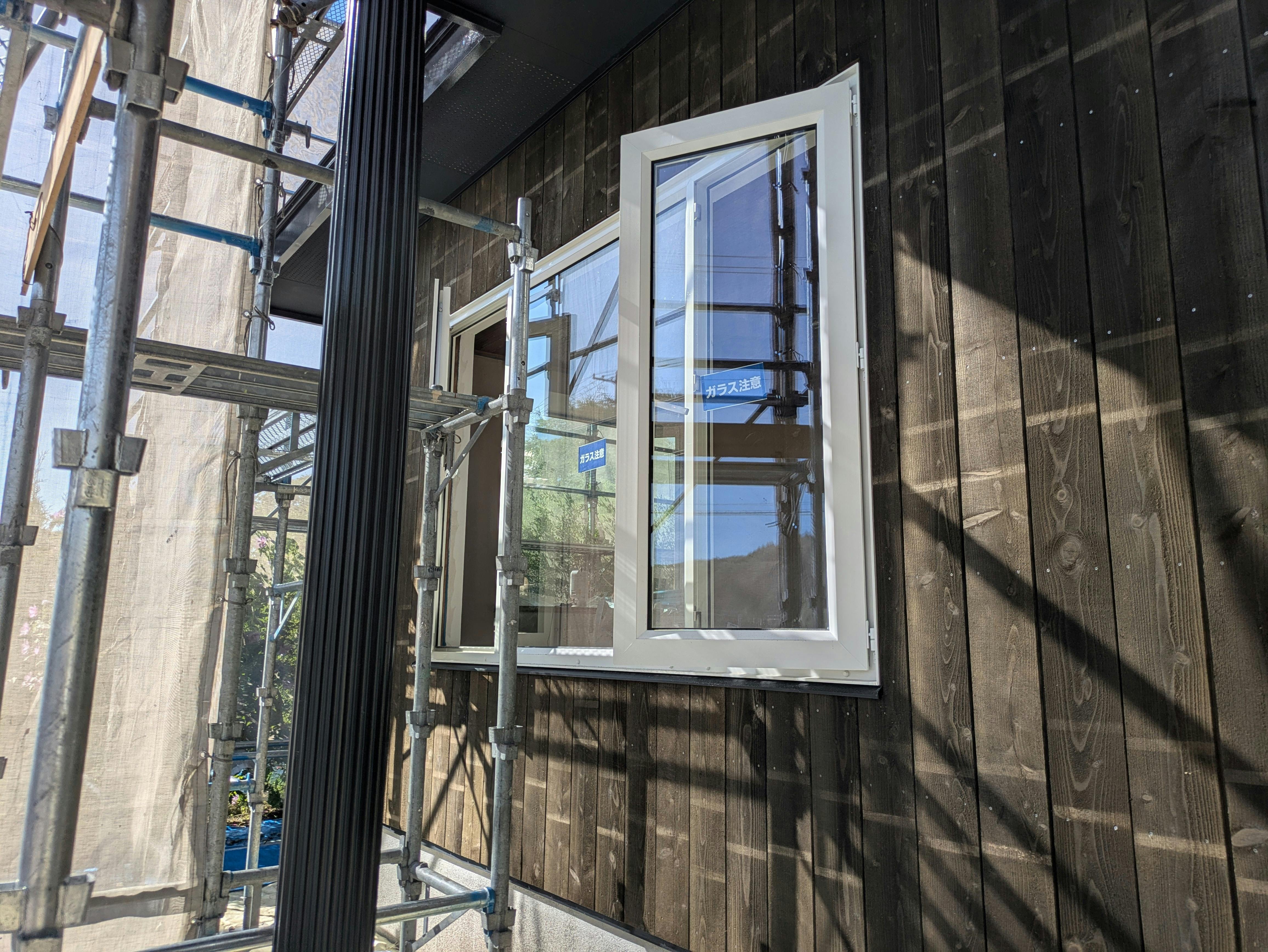 外壁が張り合わると、悪目立ちしてきた窓枠の白サッシ・・・。