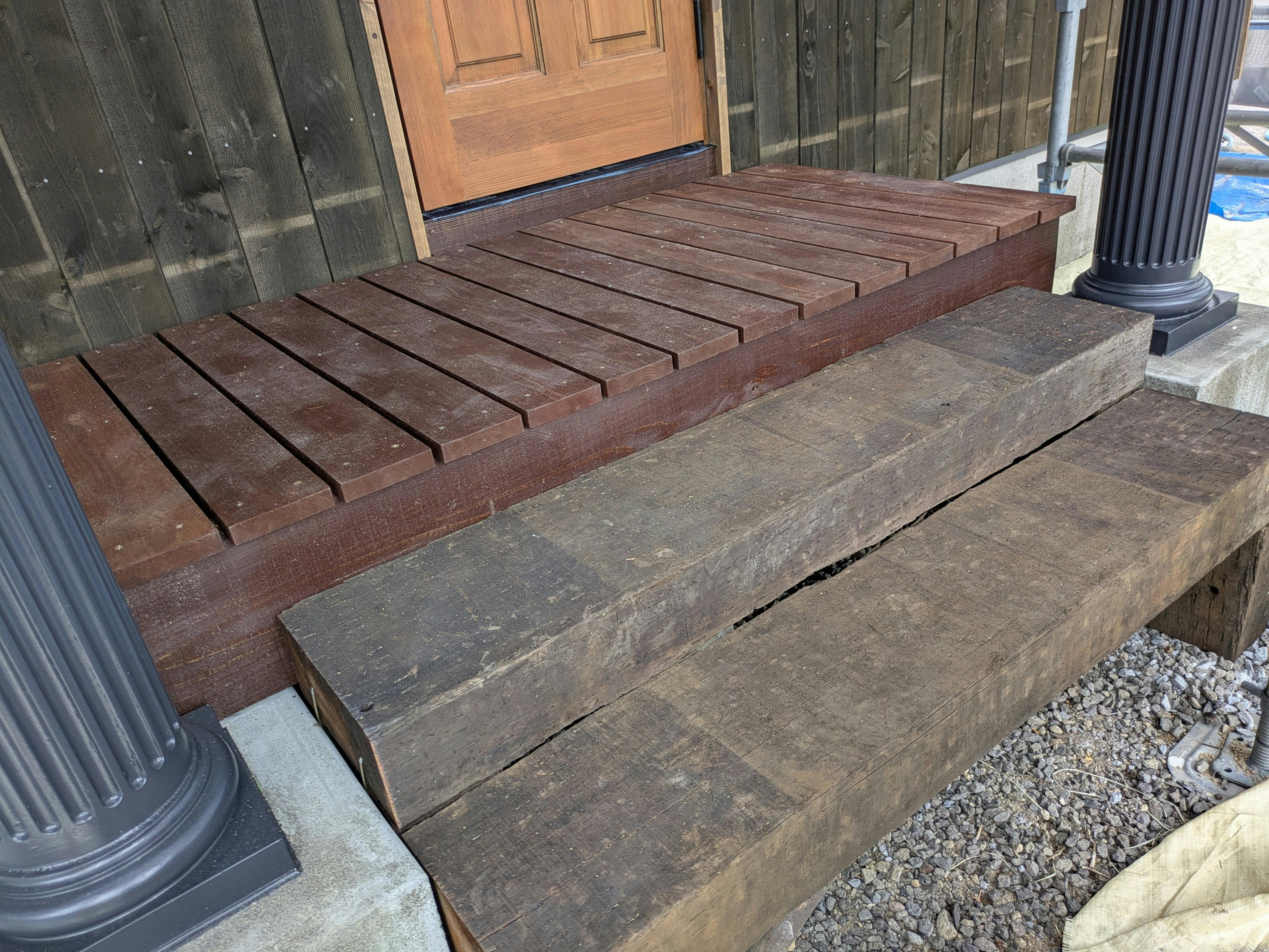 大工さんは外壁工事が終わり、すぐに店舗入り口のウッドデッキづくりに。