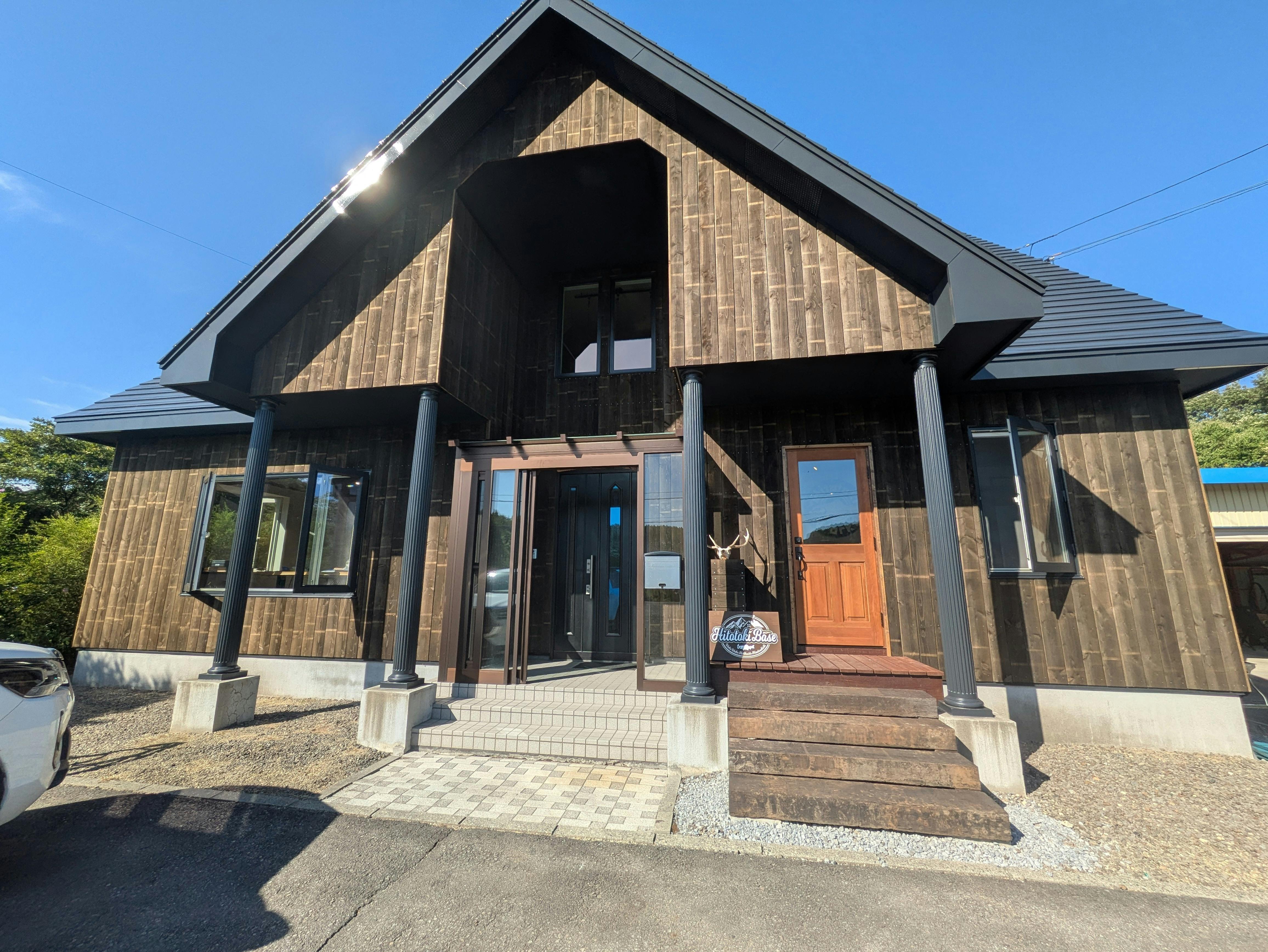 外壁の工事も終わり、カラマツ材の総張りでかなりいい感じに。
