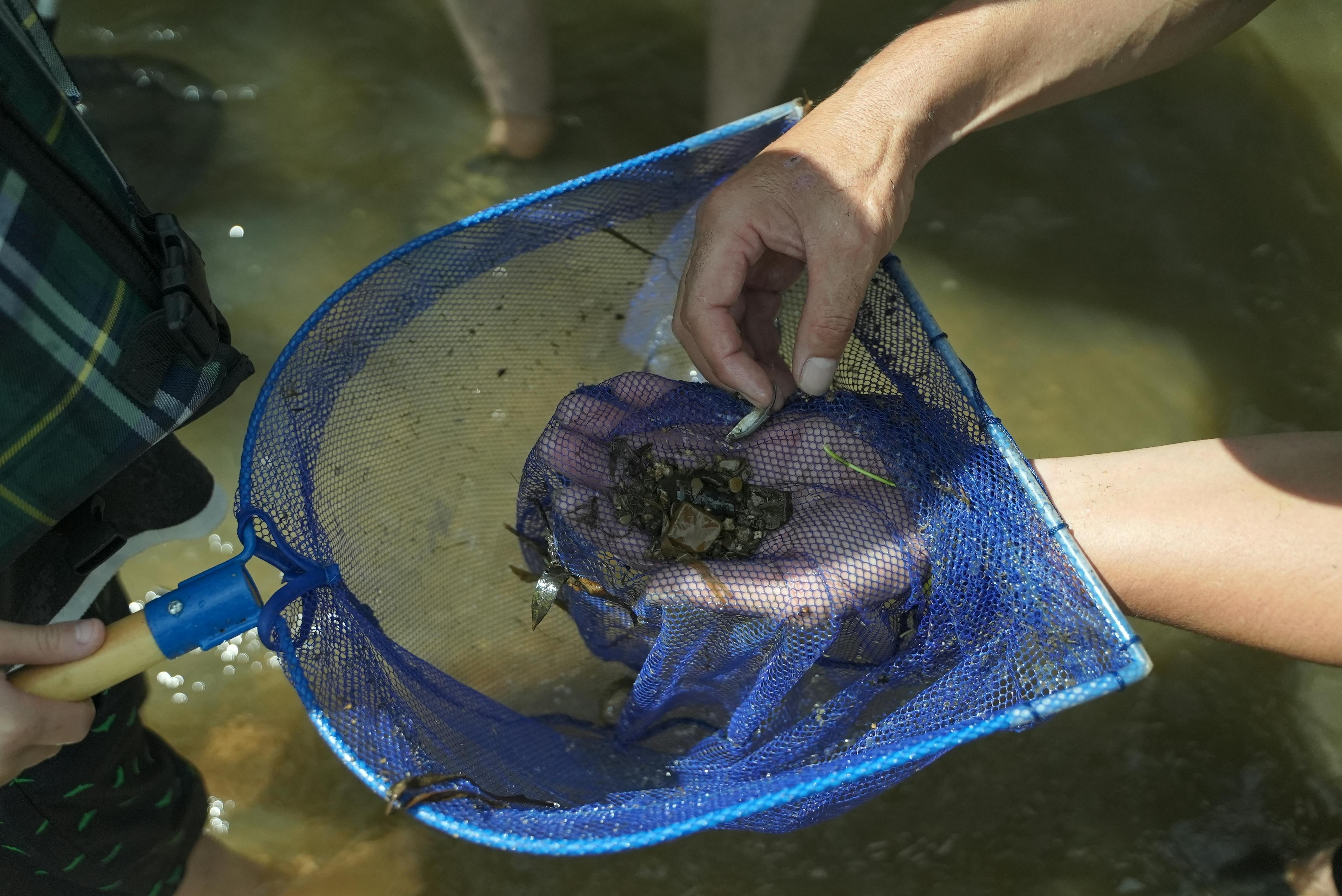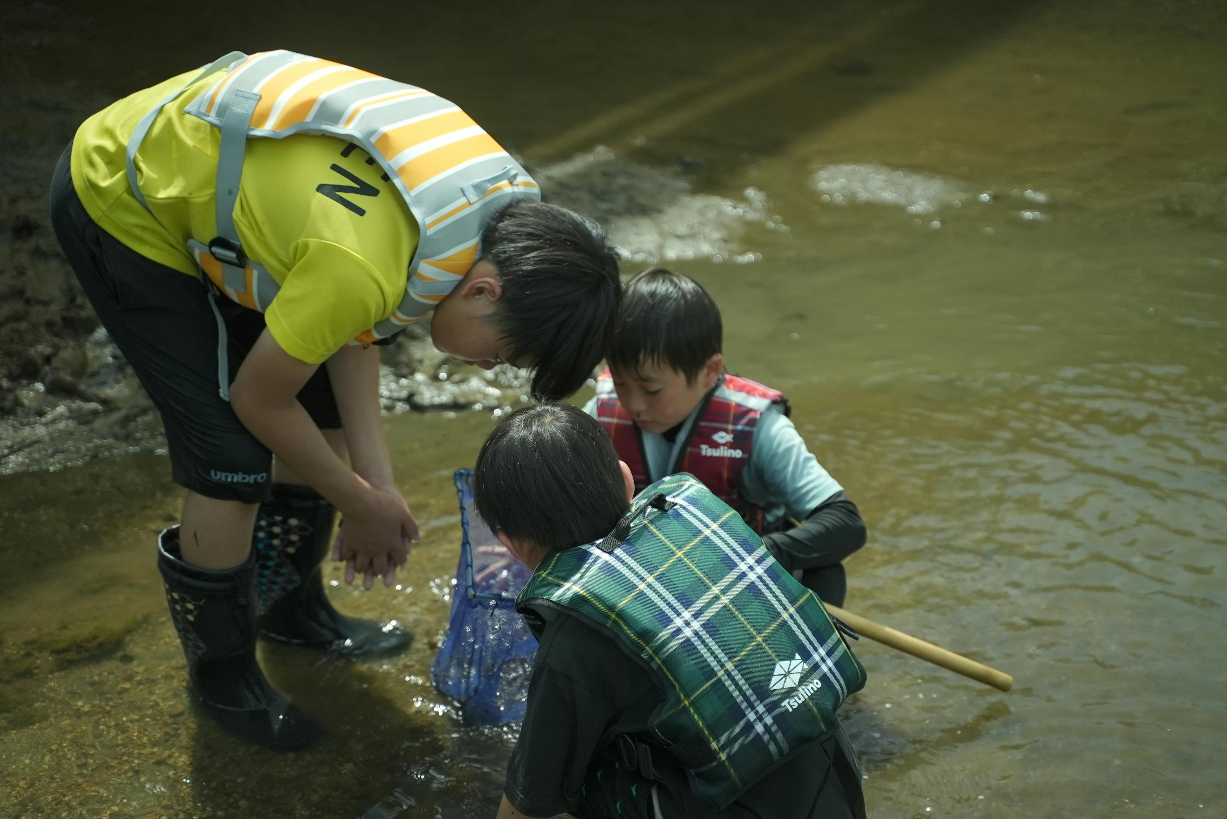 どんな生き物が採れるかウキウキしながら、シンヤ先生がお手本。