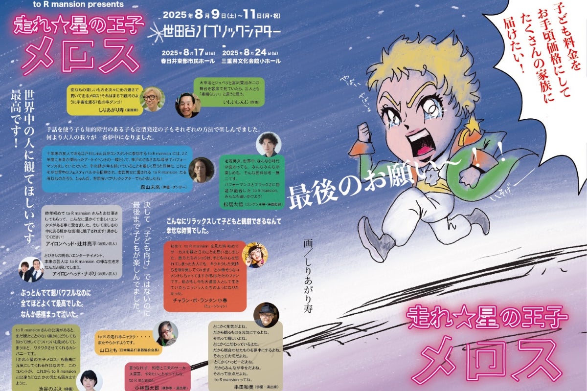 皆様のおかげで公演に向けて勢いよく走り出せたこと、そして私たちの憧れの劇場、世田谷パブリックシアターでの新演出も動き出していることに、日々感謝しながら、夢の実現に向けて、より大きな感動と驚き、面白いことをふんだんに盛り込んだ「走れ☆星の王子メロス」の創作活動に励んでいます!