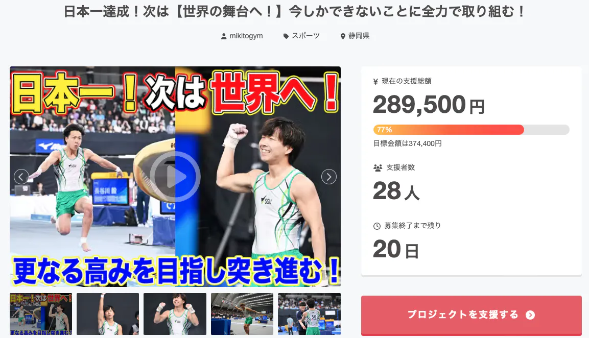 2025/07/11 11:40みなさん、いつも温かい応援を本当にありがとうございます!クラウドファンディングも残り20日となりました!!現在、支援率は77%、28名の方々にご支援いただいております。本当に、本当にありがとうございます!ひとつひとつのご支援や応援のメッセージが、毎日の原動力になっています。【そして近況のご報告です!】6月末と7月初めにかけて、**合宿(計2週間)**に参加させていただきました!練習はもちろん!普段の生活など何もかも刺激的な期間になりました!競技面も精神面も成長できた良い合宿でした!!合宿で学んだことを活かしてさらに頑張っていきたいと思います!!目標達成まであと少し…引き続き、どうかご支援・ご協力のほどよろしくお願いいたします! もっと見る