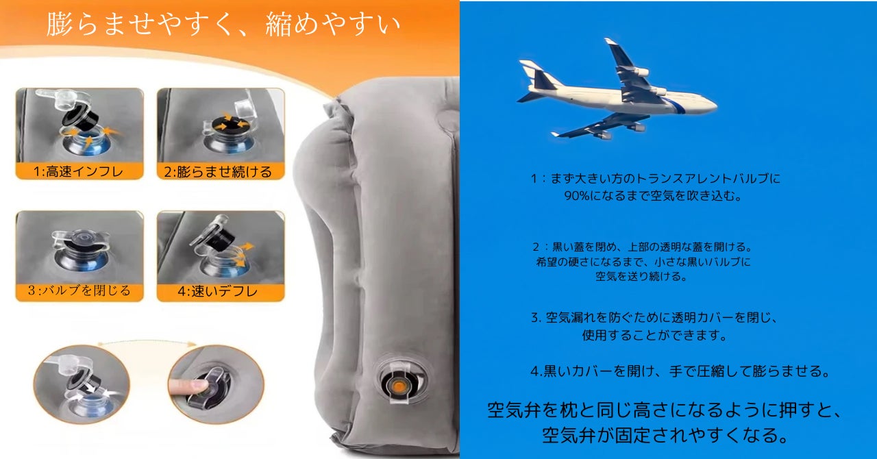 ユニークなビッグエアバルブを使用したインフレータブルトラベルピローは、通常の旅行での移動や座席での仮眠に大変役立ちます。特にエコノミー席での移動が楽になります。他のインフレータブルエアピローと比較して、膨張と収縮が簡単です。ただし、空気を入れすぎないように注意し、ある程度のスペースを残してください。これにより、飛行機のネックピローはより柔らかくなります。