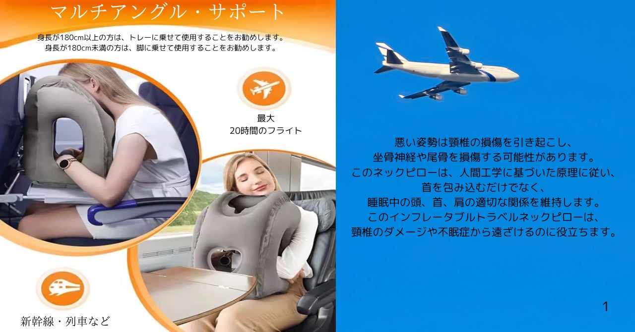 飛行機用ネックピローは、パーフェクト45°で設計されています。この角度は、頭と首が自然に前傾する理想的な角度であり、頸椎への圧力を軽減します。パーフェクト45°インフレータブルトラベルピローは、より快適な休息を提供し、眠りにつきやすくし、移動中により長く眠ることができます。