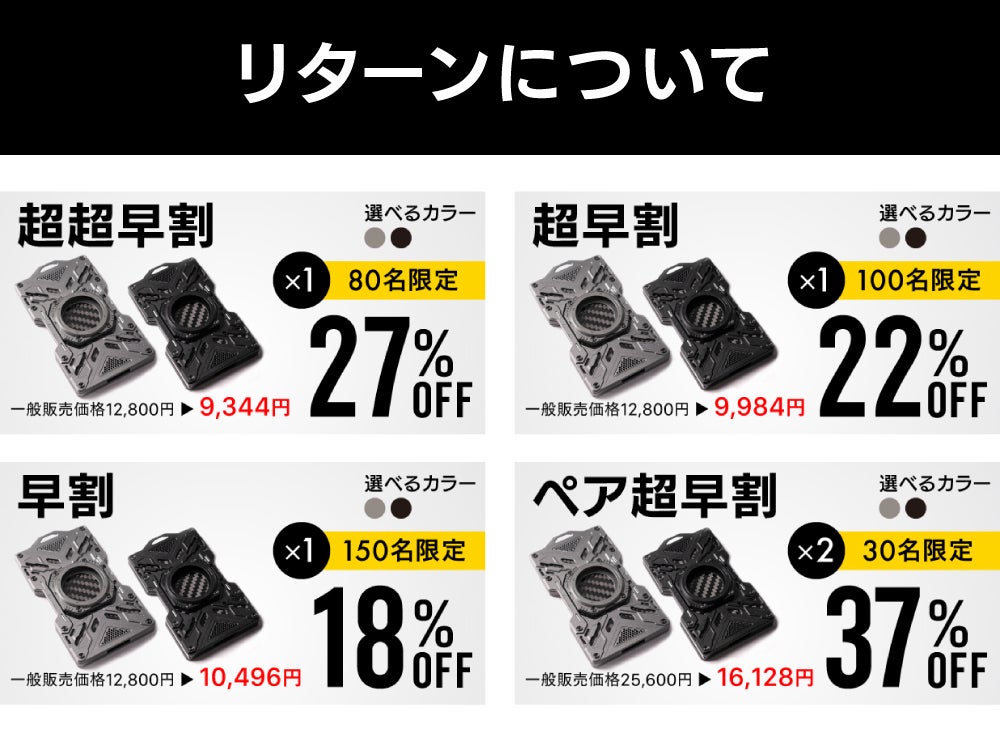 ●引渡し時期: 各リターン詳細に記載の発送予定月を引き渡し時期とします。但し、開発・生産状況によって遅れが生じる場合がありますのでその際は当プロジェクトページ内の「活動報告」または購入者へのメール等で連絡します。