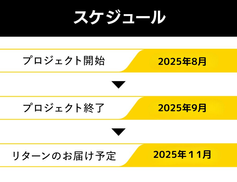 ※本文中に記載させていただいたスケジュールは、あくまでプロジェクト公開時点の予定です。ご支援の数が想定を上回った場合、製造工程上の都合等により出荷時期が遅れる場合がございます。配送遅延のおそれがございます。