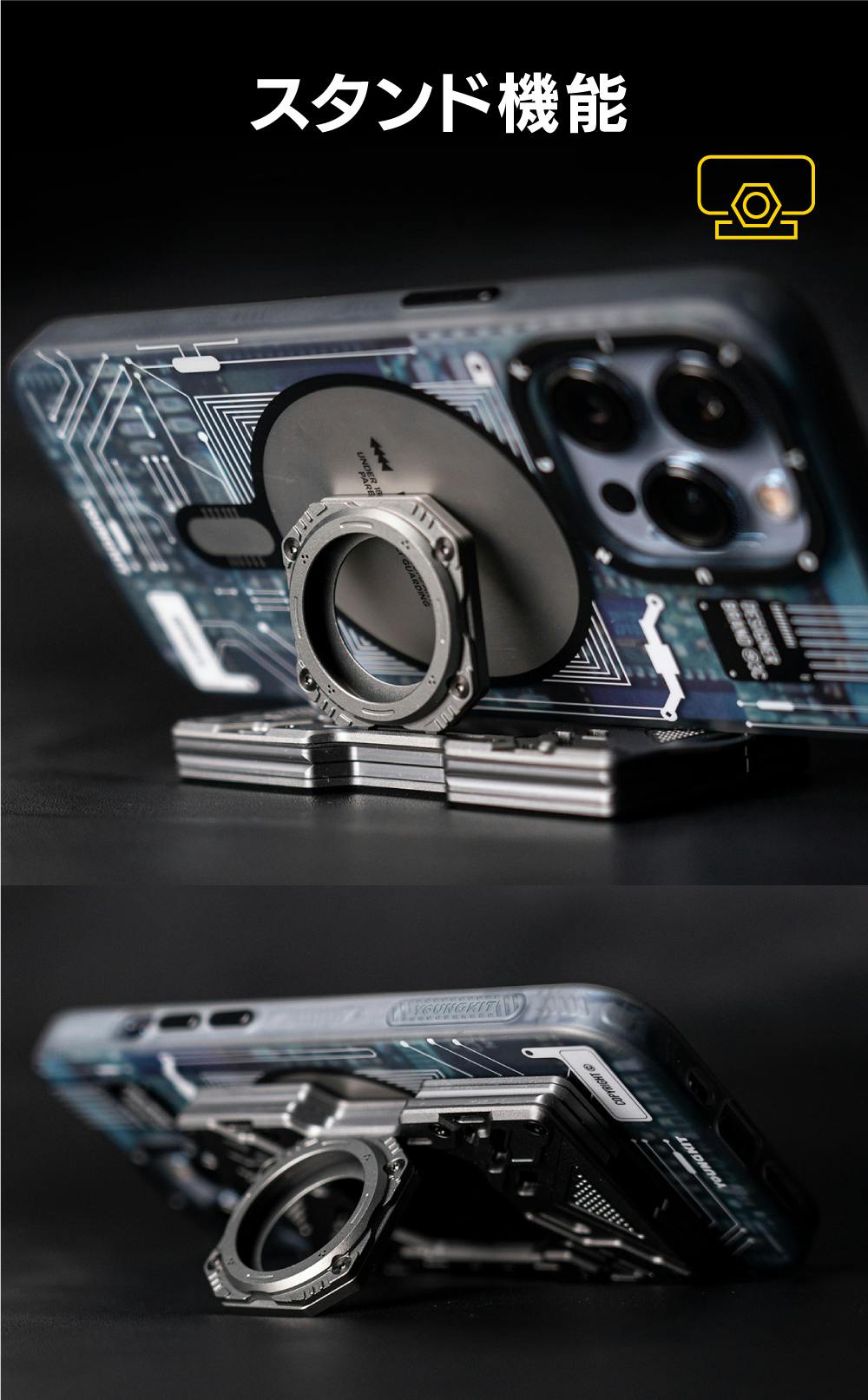 3)AirTag収納蓋:別売りのAirTagをセットする際は、付属のネジを使って本体に取り付けてください。また、スタンドとして使用する場合も、取り付けてからご利用ください。