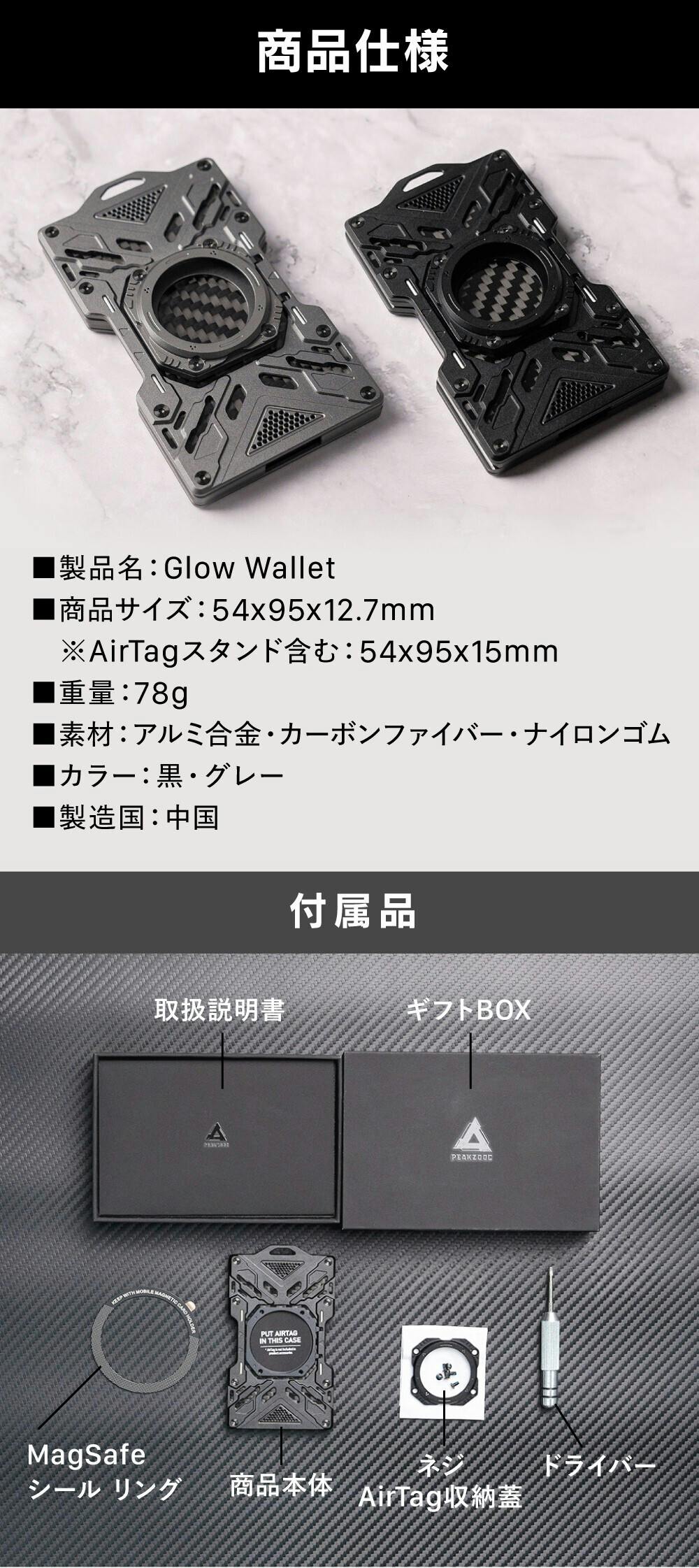 1)ドライバー:AirTag収納蓋を本体に取り付ける際にご使用ください(AirTagは付属しておりません)。ドライバーをご使用の際は、ネジ山を潰さないよう、力の入れ方に十分ご注意ください。