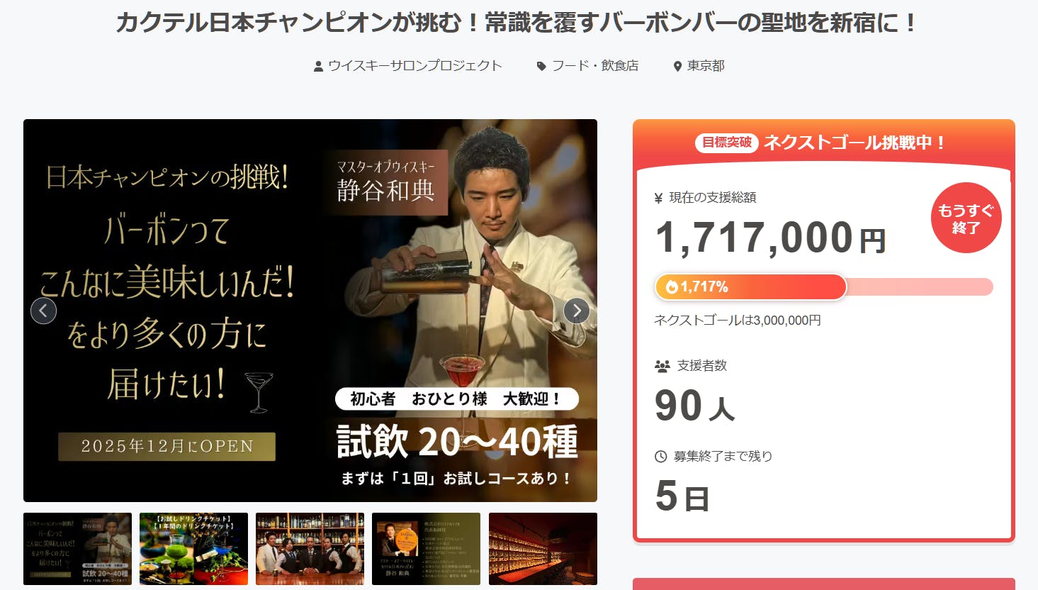 2026/03/01 18:08静谷和典が挑む "バーテンダーの未来を変える" フランチャイズバーを成功させたい!を応援いただきまして誠にありがとうございます!現在、本プロジェクトを運営しております株式会社ロイヤルマイルでは、新たなプロジェクトを立ち上げ、CAMPFIREにてクラウドファンディングを実施しております。そのプロジェクトとは、ウイスキーサロン・フランチャイズの2号店としてBAR 大宮 ウイスキーサロンのオープンに関するもので、3月1日の本日、グランドオープンを致しました!現在、目標達成に向けて鋭意活動しておりますので、もしよろしければ、ページをご一読いただければ幸いです。↓↓↓【ウイスキーサロンが大宮に進出】ウイスキーの第一人者監修の新店舗が3月オープン! もっと見る