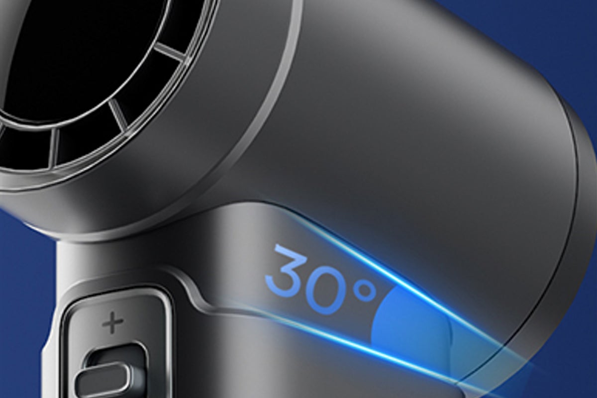 また一般のハンディファンはハンドルに対してファンが垂直に設置されていますが、【ChargeFan Pro】では30度の角度を付けています。