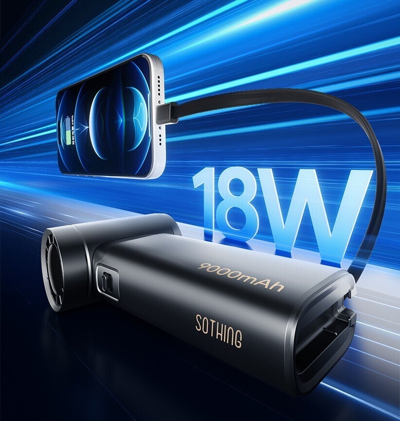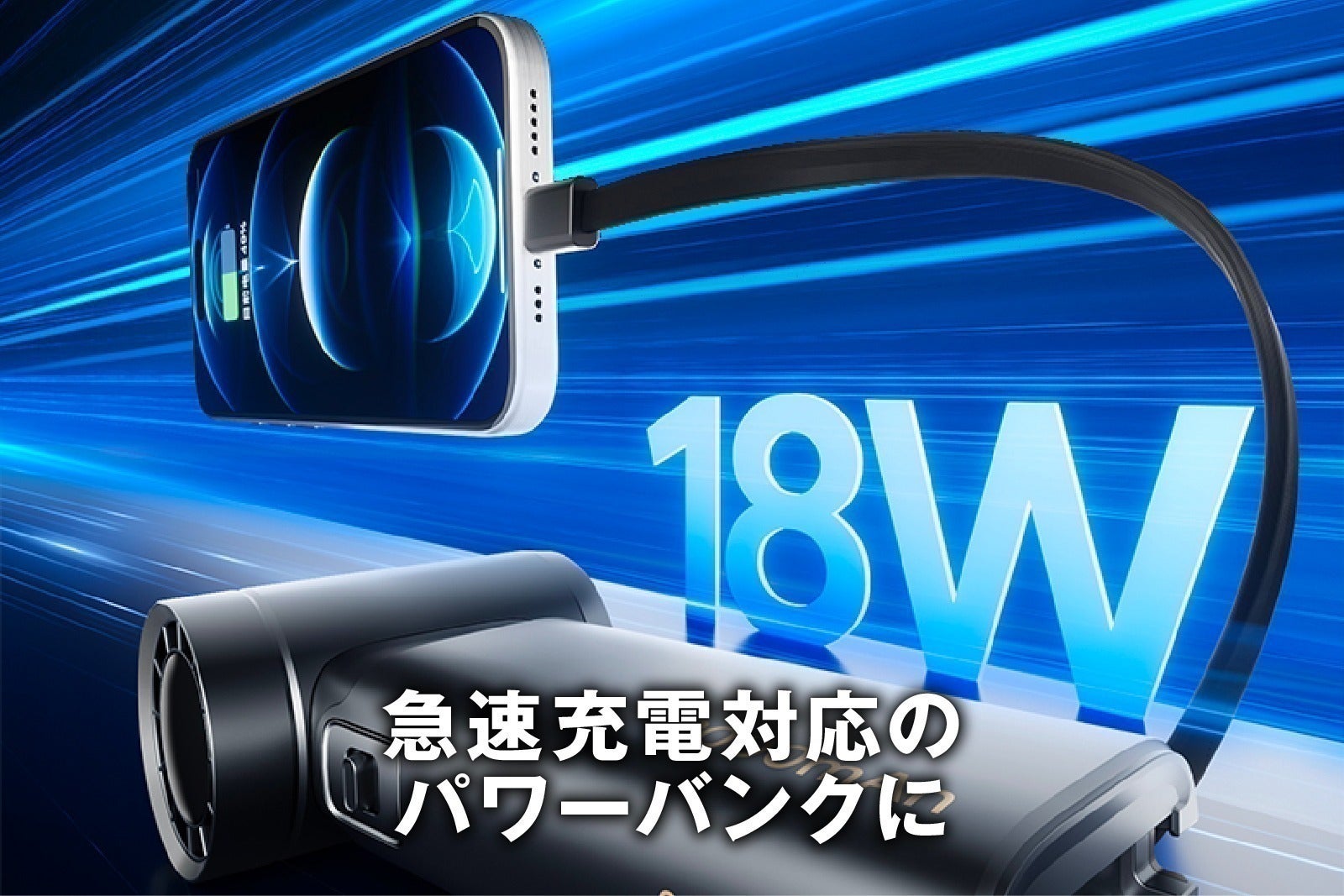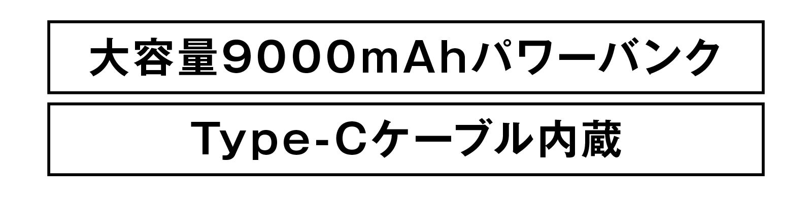 大容量9000mAhのパワーバンクとType-Cケーブル内蔵で、スマホの急速充電機能も搭載。
