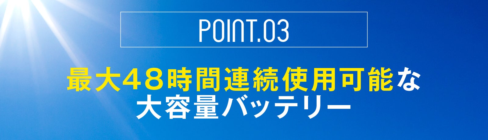 大容量バッテリーを搭載し、最大48時間も連続で使えるため電池切れの心配がなく、さらに急速充電対応のパワーバンクとしても使える優れモノ。